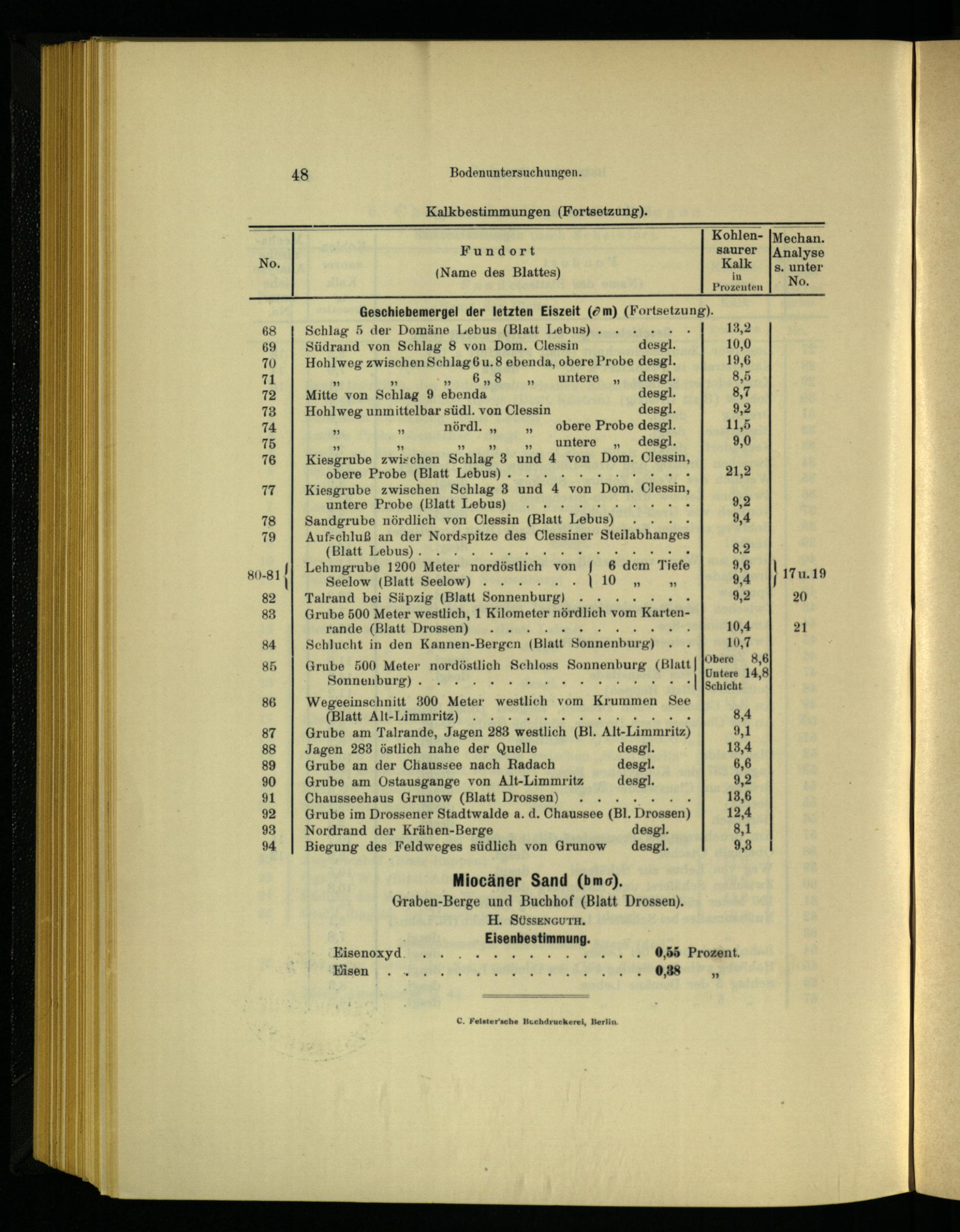Geschiebemergel der letzten Eiszeit(@m)(Fortsetzung Schlag 5 der Domäne Lebus(Blatt Lebus). aa Südrand von Schlag 8 von Dom. Clessin desgl]l. Hohlweg zwischen Schlag 6u. 8 ebenda, obere Probe desgl. ”» 0”8„.:. untere„. ‚desgl. Mitte von Schlag 9 ebenda desgl. Hohlweg unmittelbar südl. von Clessin desgl. nördl.,„obere Probe desgl. „„ untere„ desgl. Kiesgrube zwiX chen Schlag 3 und 4 von Dom. Clessin, obere Probe(Blatt Lebus)... Kiesgrube zwischen Schlag 3 und 4 von"Dom. Clessin, untere Probe(Blatt Lebus).. ex... Sandgrube nördlich von Clessin(Blatt Lebus) A Aufschluß an der Nordspitze des Clessiner Steilabhanges (Blatt Lebus).:.. Lehmgrube 1200 Meter nordöstlich von l 6 dem’ Tiefe Seelow(Blatt Seelow)..„X 10” Talrand bei Säpzig(Blatt Sonnenburg)... Grube 500 Meter westlich, 1 Kilometer nördlich vom; Kartenrande(Blatt Drossen) ‚I ‚x. Schlucht in den Kannen-Bergen(Blatt Sonnenburg) vw.