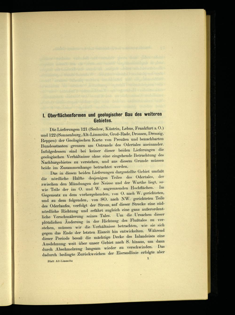 Die Lieferungen 121(Seelow , Küstrin , Lebus , Frankfurt a. O0.) und 122(Sonnenburg , Alt-Limmritz, Groß-Rade, Drossen, Drenzig, Reppen ) der Geologischen Karte von Preußen und benachbarten Bundesstaaten grenzen am Ostrande des Odertales aneinander. Infolgedessen sind bei keiner dieser beiden Lieferungen die geologischen Verhältnisse ohne eine eingehende Betrachtung des Nachbargebietes zu verstehen, und aus diesem Grunde müssen beide im Zusammenhange betrachtet werden.