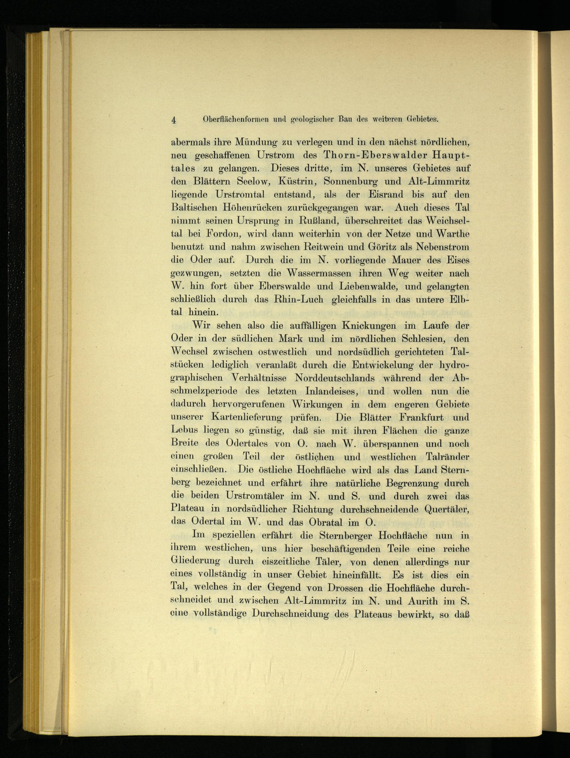 Wir sehen also die auffälligen Knickungen im Laufe der Oder in der südlichen Mark und im nördlichen Schlesien, den Wechsel zwischen ostwestlich und nordsüdlich gerichteten Talstücken lediglich veranlaßt durch die Entwickelung der hydrographischen Verhältnisse Norddeutschlands während der Abschmelzperiode des letzten Inlandeises, und wollen nun die dadurch heryorgerufenen Wirkungen in dem engeren Gebiete unserer Kartenlieferung prüfen. Die Blätter Frankfurt und Lebus liegen so günstig, daß sie mit ihren Flächen die ganze Breite des Odertales von O. nach W. überspannen und noch einen großen Teil der östlichen und westlichen Talränder einschließen. Die östliche Hochfläche wird als das Land Sternberg bezeichnet und erfährt ihre natürliche Begrenzung durch die beiden Urstromtäler im N. und S. und durch zwei das Plateau in nordsüdlicher Richtung durchschneidende Quertäler, das Odertal im W. und das Obratal im O.