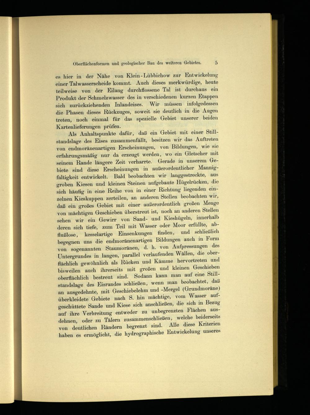 Als Anhaltspunkte dafür, daß ein Gebiet mit einer Stillstandslage des Eises zusammenfällt, besitzen wir das Auftreten von endmoränenartigen Erscheinungen, von Bildungen, wie sie erfahrungsmäßig nur da erzeugt werden, wo ein Gletscher mit seinem Rande längere Zeit verharrte. Gerade in unserem Gebiete sind diese Erscheinungen in außerordentlicher Mannigfaltigkeit entwickelt. Bald beobachten wir langgestreckte, aus groben Kiesen und kleinen Steinen aufgebaute Hügelrücken, die sich häufig in eine Reihe von in einer Richtung liegenden einzelnen Kieskuppen zerteilen, an anderen Stellen beobachten wir, daß ein großes Gebiet mit einer außerordentlich großen Menge von mächtigen Geschieben überstreut ist, noch an anderen Stellen sehen wir ein Gewirr von Sand- und Kieshügeln, innerhalb deren sich tiefe, zum Teil mit Wasser oder Moor erfüllte, abflußlose, kesselartige KEinsenkungen finden, und schließlich begegnen uns die endmoränenartigen Bildungen auch in Form von sogenannten Staumoränen, d. h. von Aufpressungen des Untergrundes in. langen, parallel verlaufenden Wällen, die oberflächlich gewöhnlich. als Rücken und Kämme hervortreten und bisweilen auch ihrerseits mit großen und kleinen Geschieben oberflächlich bestreut sind. Sodann kann man auf eine Stillstandslage des Hisrandes schließen, wenn man beobachtet, daß an ausgedehnte, mit Geschiebelehm und-Mergel(Grundmoräne) überkleidete Gebiete nach S. hin mächtige, vom Wasser aufgeschüttete Sande und Kiese sich anschließen, die sich in Bezug auf ihre Verbreitung entweder zu unbegrenzten Flächen ausdehnen, oder zu Tälern zusammenschließen, welche beiderseits von deutlichen Rändern begrenzt sind. Alle diese Kriterien haben es ermöglicht, die hydrographische Entwickelung unseres