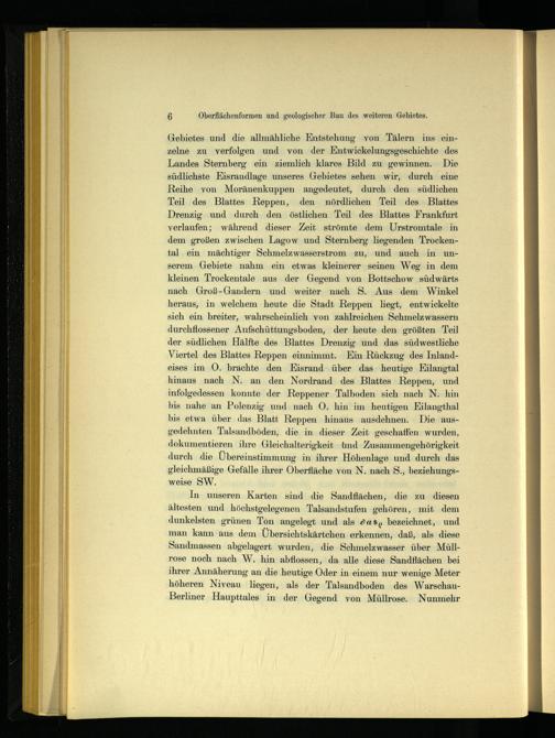 Gebietes und die allmähliche Entstehung von Tälern ins einzelne zu verfolgen und von der Entwickelungsgeschichte des Landes Sternberg ein ziemlich klares Bild zu gewinnen. Die südlichste Eisrandlage unseres Gebietes sehen wir, durch eine Reihe von Moränenkuppen angedeutet, durch den südlichen Teil des Blattes Reppen , den nördlichen Teil des Blattes Drenzig und durch den östlichen Teil des Blattes Frankfurt verlaufen; während dieser Zeit strömte dem Urstromtale in dem großen zwischen Lagow und Sternberg liegenden Trockental ein mächtiger Schmelzwasserstrom zu, und auch in unserem Gebiete nahm ein etwas kleinerer seinen Weg in dem kleinen Trockentale aus der Gegend von Bottschow südwärts nach Groß-Gandern und weiter nach S. Aus dem Winkel heraus, in welchem heute die Stadt Reppen liegt, entwickelte sich ein breiter, wahrscheinlich von zahlreichen Schmelzwassern durchflossener Aufschüttungsboden, der heute den größten Teil der südlichen Hälfte des Blattes Drenzig und das südwestliche Viertel des Blattes Reppen einnimmt. Ein Rückzug des Inlandeises im O. brachte den KEisrand über das heutige HKilangtal hinaus nach N. an den Nordrand des Blattes Reppen , und infolgedessen konnte der Reppener Talboden sich nach N. hin bis nahe an Polenzig und nach O. hin im heutigen Eilangthal bis etwa über das Blatt Reppen hinaus ausdehnen. Die ausgedehnten Talsandböden, die in dieser Zeit geschaffen wurden, dokumentieren ihre Gleichalterigkeit Und Zusammengehörigkeit durch die Übereinstimmung in ihrer Höhenlage und durch das gleichmäßige Gefälle ihrer Oberfläche von N. nach S., beziehungsweise SW.