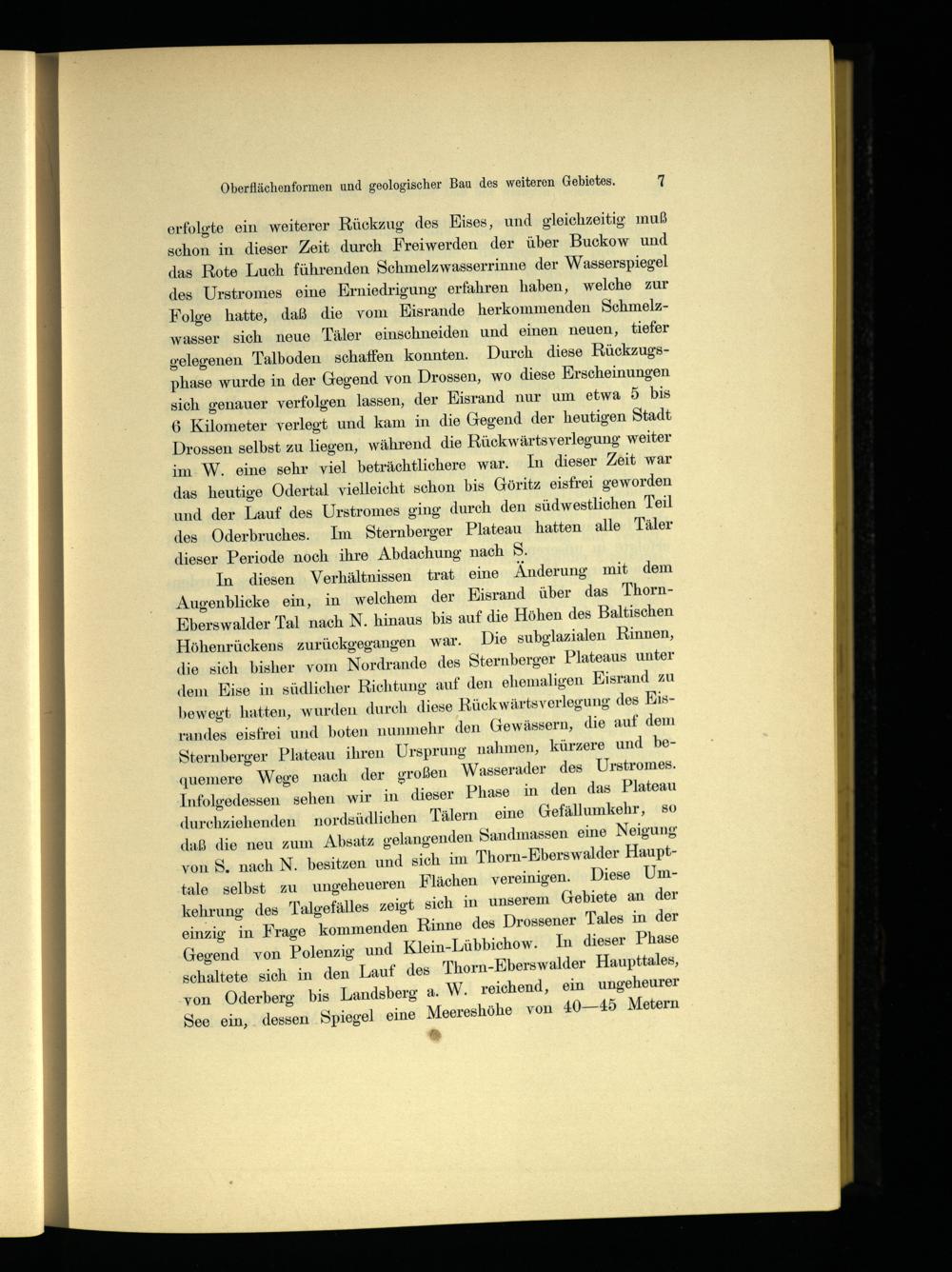 In diesen Verhältnissen trat eine Änderung mit dem Augenblicke ein, in welchem der Eisrand über das ThornEberswalder Tal nach N. hinaus bis auf die Höhen des Baltischen Höhenrückens zurückgegangen war. Die subglazialen Rinnen, die sich bisher vom Nordrande des Sternberger Plateaus unter dem Eise in südlicher Richtung auf den ehemaligen Eisrand zu bewegt hatten, wurden durch diese Rückwärtsverlegung des Eisrandes eisfrei und boten nunmehr den Gewässern, die auf dem Sternberger Plateau ihren Ursprung nahmen, kürzere und bequemere Wege nach der großen Wasserader des Urstromes. Infolgedessen sehen wir in dieser Phase in den das Plateau durchziehenden nordsüdlichen Tälern eine Gefällumkehr, so daß die neu zum Absatz gelangenden Sandmassen. eine Neigung von S. nach N. besitzen und sich im Thorn-Eberswalder Haupttale selbst zu ungeheueren Flächen vereinigen. Diese Umkehrung des Talgefälles zeigt sich in unserem Gebiete an der einzig in Frage kommenden Rinne des Drossener Tales in der Gegend von Polenzig und Klein-Lübbichow. In dieser Phase schaltete sich in den‘ Lauf des Thorn-Eberswalder Haupttales, von Oderberg bis Landsberg a. W. reichend, ein ungeheurer See ein,. dessen ‚Spiegel eine Meereshöhe von 40—45 Metern