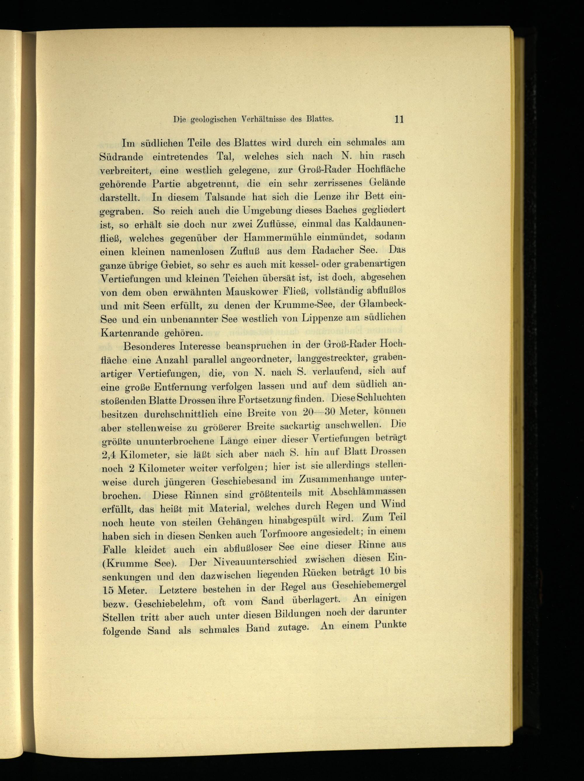 Im südlichen Teile des Blattes wird durch ein schmales am Südrande eintretendes Tal, welches sich nach N. hin rasch verbreitert, eine westlich gelegene, zur Groß-Rader Hochfläche gehörende Partie abgetrennt, die ein sehr zerrissenes Gelände darstellt. In diesem Talsande hat sich die Lenze ihr Bett eingegraben. So reich auch die Umgebung dieses Baches gegliedert ist, so erhält sie doch nur zwei Zuflüsse, einmal das Kaldaunenfließ, welches gegenüber der Hammermühle einmündet, sodann einen kleinen namenlosen Zufluß aus dem Radacher See. Das ganze übrige Gebiet, so sehr es auch mit kessel- oder grabenartigen Vertiefungen und kleinen Teichen übersät ist, ist doch, abgesehen von dem oben erwähnten Mauskower Fließ , vollständig abflußlos und mit Seen erfüllt, zu denen der Krumme-See, der GlambeckSee und ein unbenannter See westlich von Lippenze am südlichen Kartenrande gehören.