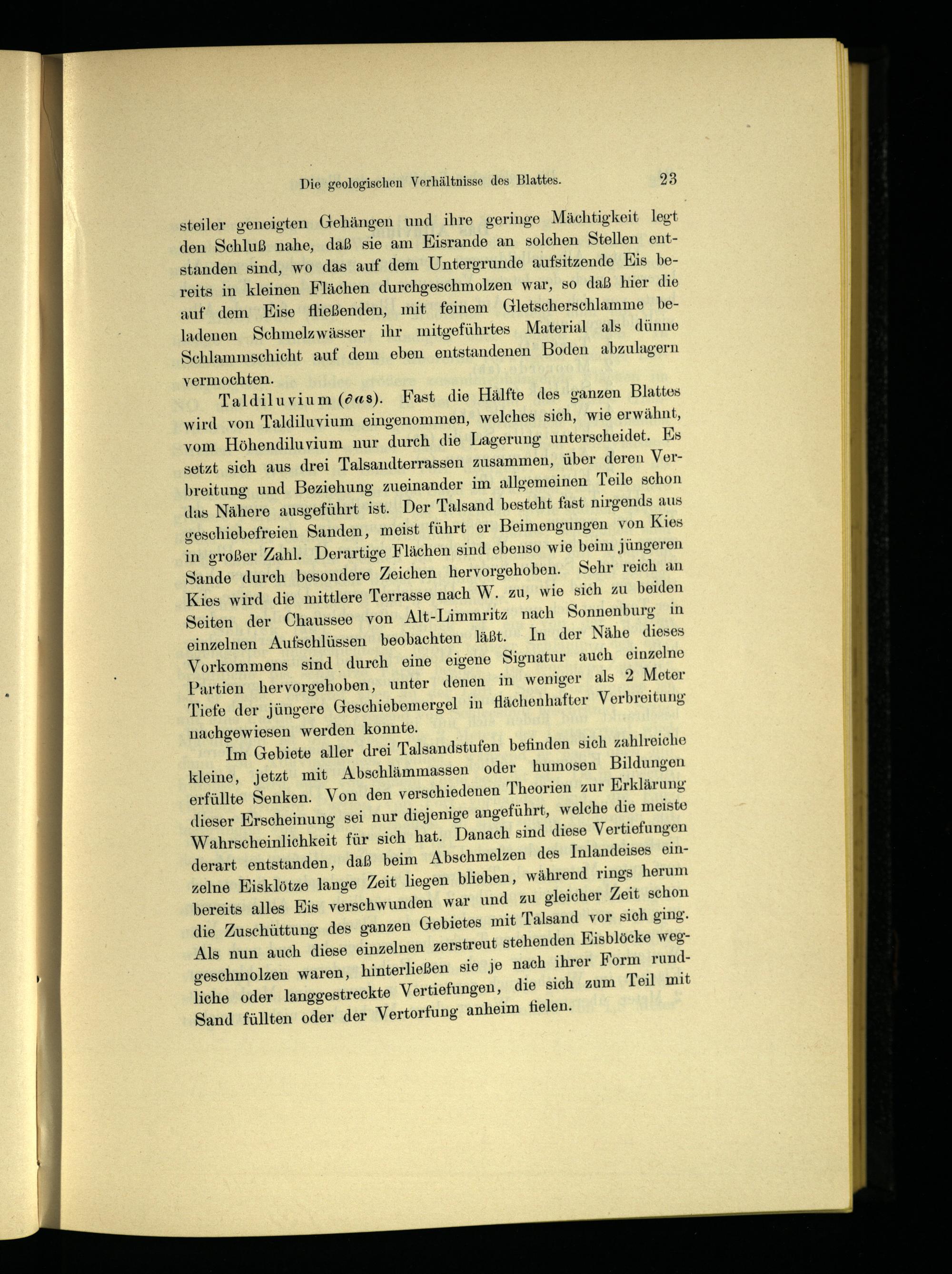 Taldiluvium(das). Fast die Hälfte des ganzen Blattes wird von Taldiluvium eingenommen, welches sich, wie erwähnt, vom Höhendiluvium nur durch die Lagerung unterscheidet. Ks setzt sich aus drei Talsandterrassen zusammen, über deren Verbreitung und Beziehung zueinander im allgemeinen Teile schon das Nähere ausgeführt ist. Der Talsand besteht fast nirgends aus geschiebefreien Sanden, meist führt er Beimengungen von Kies in großer Zahl. Derartige Flächen sind ebenso wie beim jüngeren Sande durch besondere Zeichen hervorgehoben. Sehr reich an Kies wird die mittlere Terrasse nach W. zu, wie sich zu beiden Seiten der Chaussee von Alt-Limmritz nach Sonnenburg in einzelnen Aufschlüssen beobachten läßt. In der Nähe dieses Vorkommens sind durch eine eigene Signatur auch einzelne Partien hervorgehoben, unter denen in weniger als 2 Meter Tiefe der jüngere Geschiebemergel in flächenhafter Verbreitung nachgewiesen werden konnte.