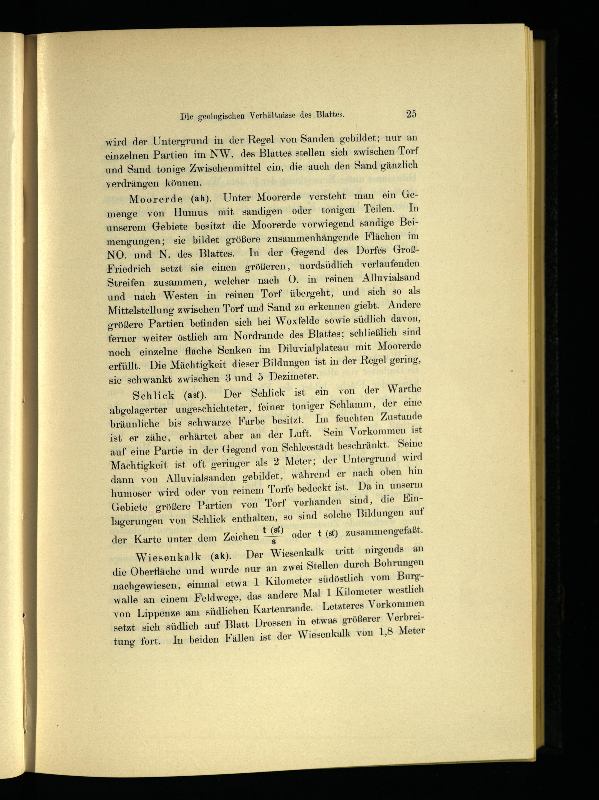 Moorerde(ah). Unter Moorerde versteht man ein Gemenge von Humus mit sandigen oder tonigen Teilen. In unserem Gebiete besitzt die Moorerde vorwiegend sandige Beimengungen; sie bildet größere zusammenhängende Flächen im NO. und N. des Blattes. In der Gegend des Dorfes GroßFriedrich setzt sie einen größeren, nordsüdlich verlaufenden Streifen zusammen, welcher nach O. in reinen Alluvialsand und nach Westen in reinen Torf übergeht, und sich so als Mittelstellung zwischen Torf und Sand zu erkennen giebt. Andere größere Partien befinden sich bei Woxfelde sowie südlich davon, ferner weiter östlich am Nordrande des Blattes; schließlich sind noch einzelne flache Senken im Diluvialplateau mit Moorerde erfüllt. Die Mächtigkeit dieser Bildungen ist in der Regel gering, sie schwankt zwischen 3 und 5 Dezimeter.