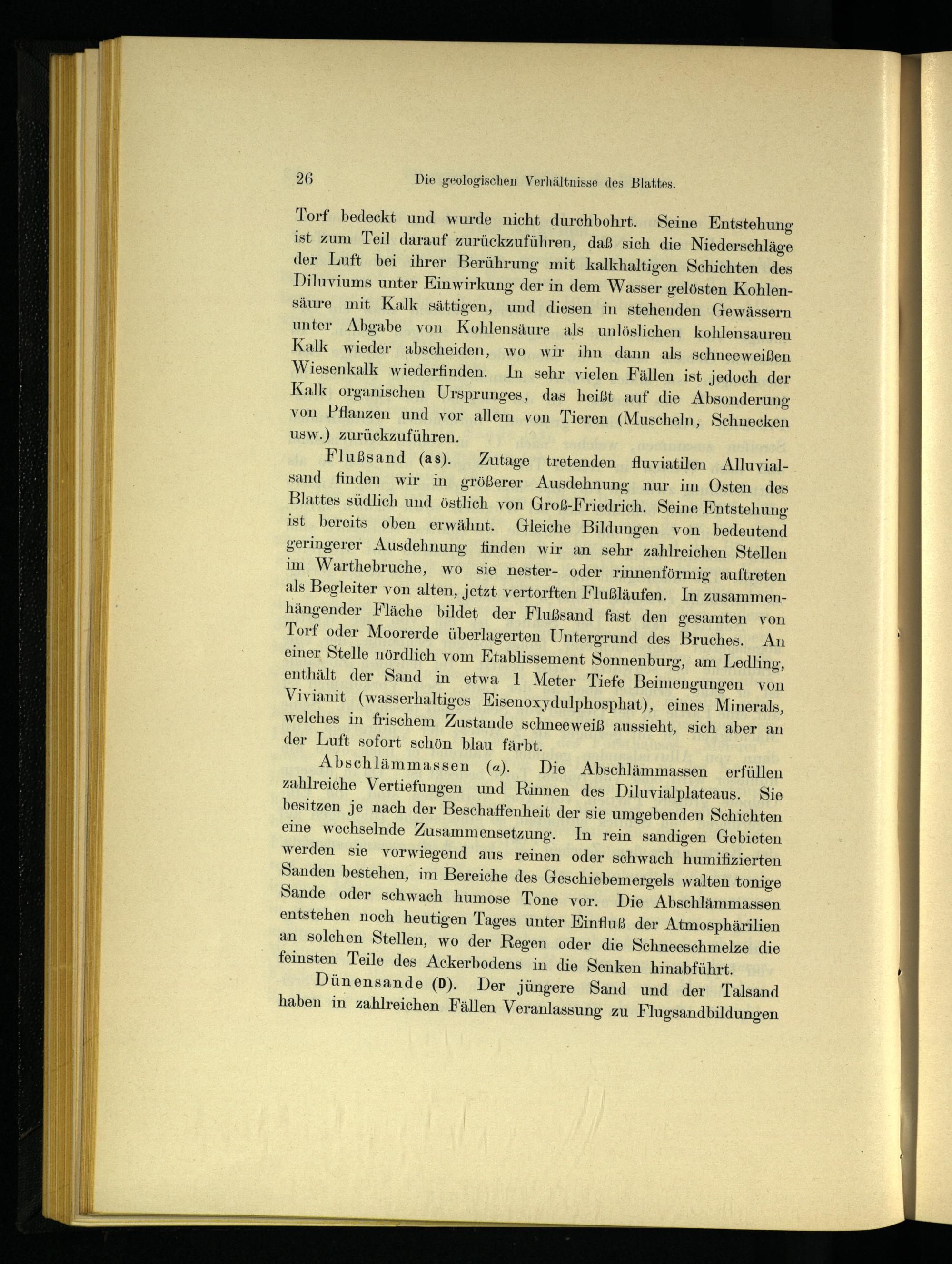 Flußsand(as). Zutage tretenden fluviatilen Alluvialsand finden wir in größerer Ausdehnung nur im Osten des Blattes südlich und östlich von Groß-Friedrich. Seine Entstehung ist bereits oben erwähnt.(Gleiche Bildungen von bedeutend geringerer Ausdehnung finden wir an sehr zahlreichen Stellen im Warthebruche, wo sie nester- oder rinnenförmig auftreten als Begleiter von alten, jetzt vertorften Flußläufen. In zusammenhängender Fläche bildet der Flußsand fast den gesamten von Torf oder Moorerde überlagerten Untergrund des Bruches. An einer Stelle nördlich vom Etablissement Sonnenburg, am Ledling, enthält der Sand in etwa 1 Meter Tiefe Beimengungen von Vivianit(wasserhaltiges Eisenoxydulphosphat), eines Minerals, welches in frischem Zustande schneeweiß aussieht, sich aber an der Luft sofort schön blau färbt.