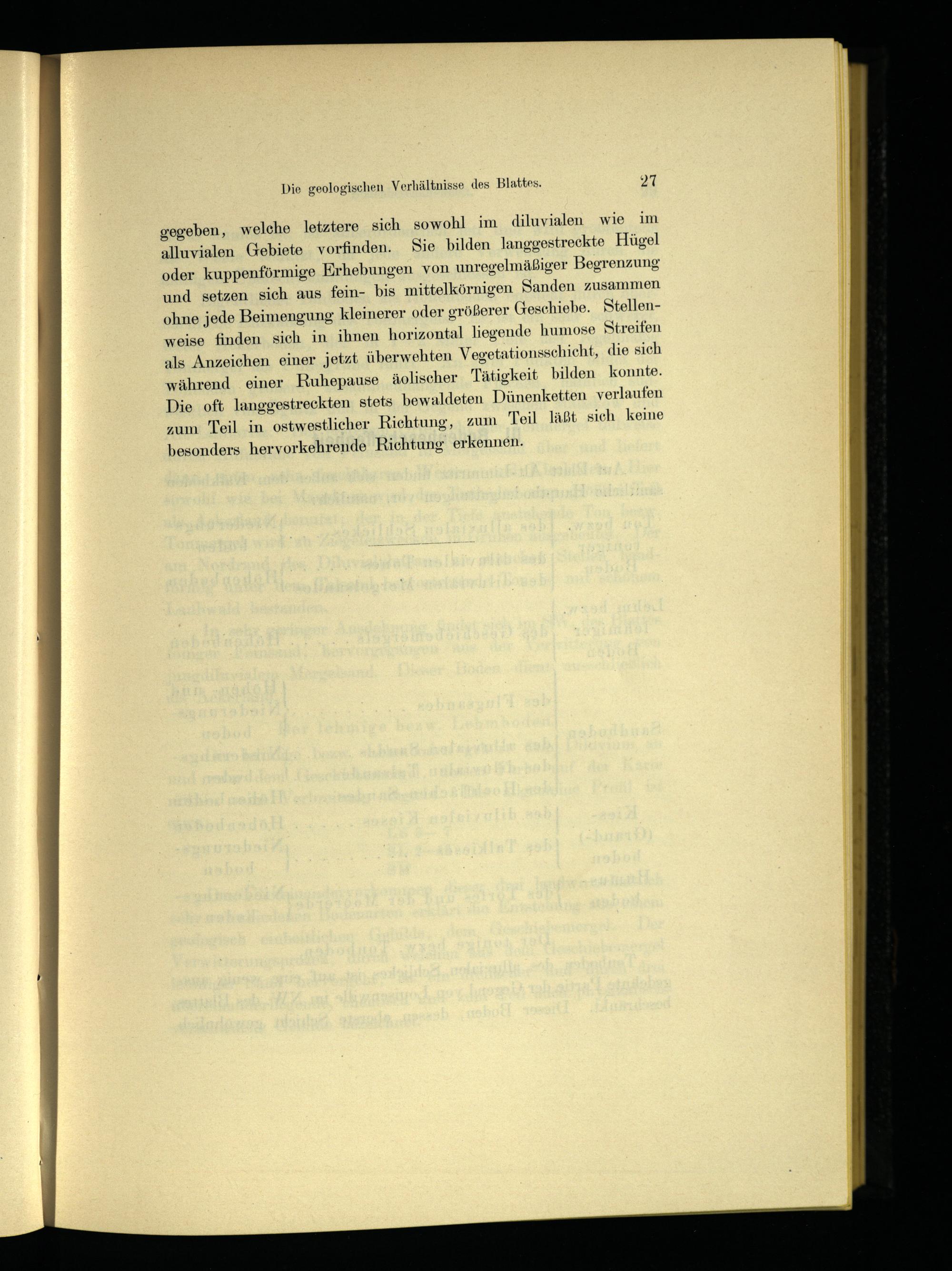 als Anzeichen einer jetzt überwehten Vegetationsschicht, die sich während ‚einer Ruhepause äolischer Tätigkeit bilden konnte. Die oft langgestreckten stets bewaldeten Dünenketten verlaufen zum Teil in ostwestlicher Richtung, zum Teil läßt sich keine besonders hervorkehrende Richtung erkennen.