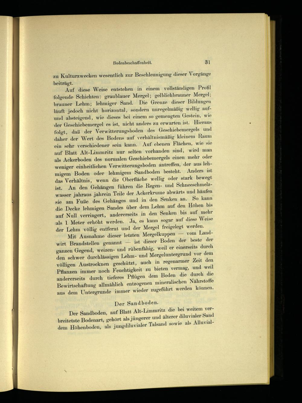 Mit Ausnahme dieser letzten Mergelkuppen— vom Landwirt Brandstellen genannt— ist dieser Boden der beste der ganzen Gegend, weizen- und rübenfähig, weil er einerseits durch den schwer durchlässigen Lehm- und Mergeluntergrund vor dem völligen Austrocknen geschützt, auch in regenarmer Zeit den Pflanzen immer noch Feuchtigkeit zu bieten vermag, und weil andererseits durch: tieferes Pflügen dem Boden die durch die Bewirtschaftung allmählich entzogenen mineralischen Nährstoffe