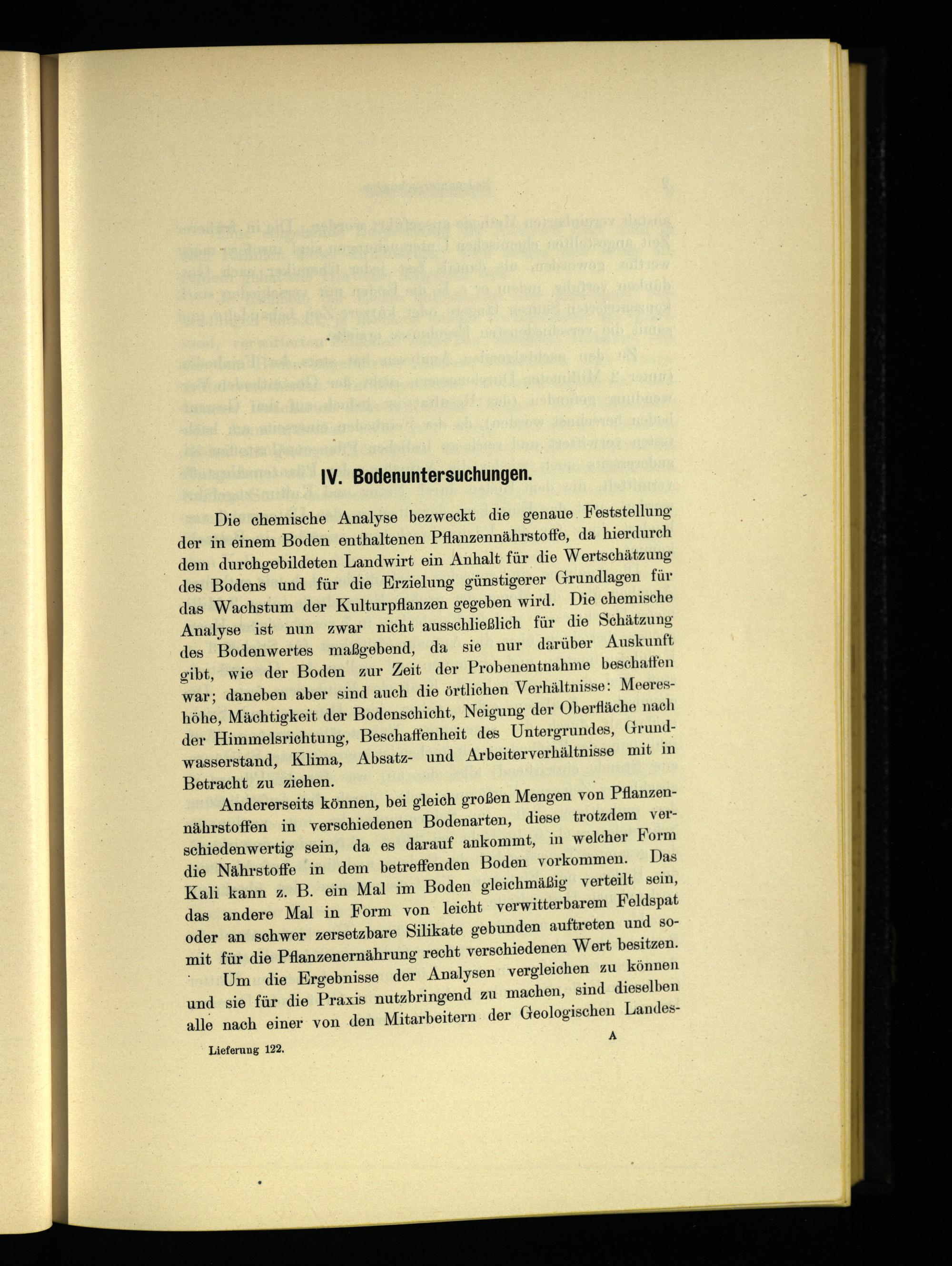 Die chemische Analyse bezweckt die genaue. F eststellung der in einem Boden enthaltenen Pflanzennährstoffe, da hierdurch dem durchgebildeten Landwirt ein Anhalt für die Wertschätzung des Bodens und für die Erzielung günstigerer Grundlagen für das Wachstum der Kulturpflanzen gegeben wird. Die chemische Analyse ist nun zwar nicht ausschließlich für die Schätzung des Bodenwertes maßgebend, da sie nur darüber Auskunft gibt, wie der Boden zur Zeit der Probenentnahme beschaffen war; daneben aber sind auch die örtlichen Verhältnisse: Meereshöhe, Mächtigkeit der Bodenschicht, Neigung der Oberfläche nach der Himmelsrichtung, Beschaffenheit des Untergrundes, Grundwasserstand, Klima, Absatz- und Arbeiterverhältnisse mit in Betracht zu ziehen.;