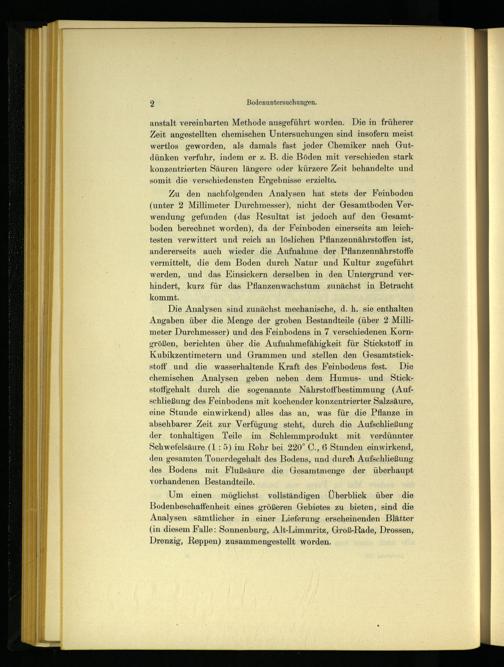 Zu den nachfolgenden Analysen hat stets der Feinboden (unter 2 Millimeter Durchmesser), nicht der Gesamtboden Verwendung gefunden(das Resultat ist jedoch auf den Gesamtboden berechnet worden), da der Feinboden einerseits am leichtesten verwittert und reich an löslichen Pflanzennährstoffen ist, andererseits auch wieder die Aufnahme der Pflanzennährstoffe vermittelt, die dem Boden durch Natur und Kultur zugeführt werden, und das Einsickern derselben in den Untergrund verhindert, kurz für das Pflanzenwachstum zunächst in Betracht kommt.