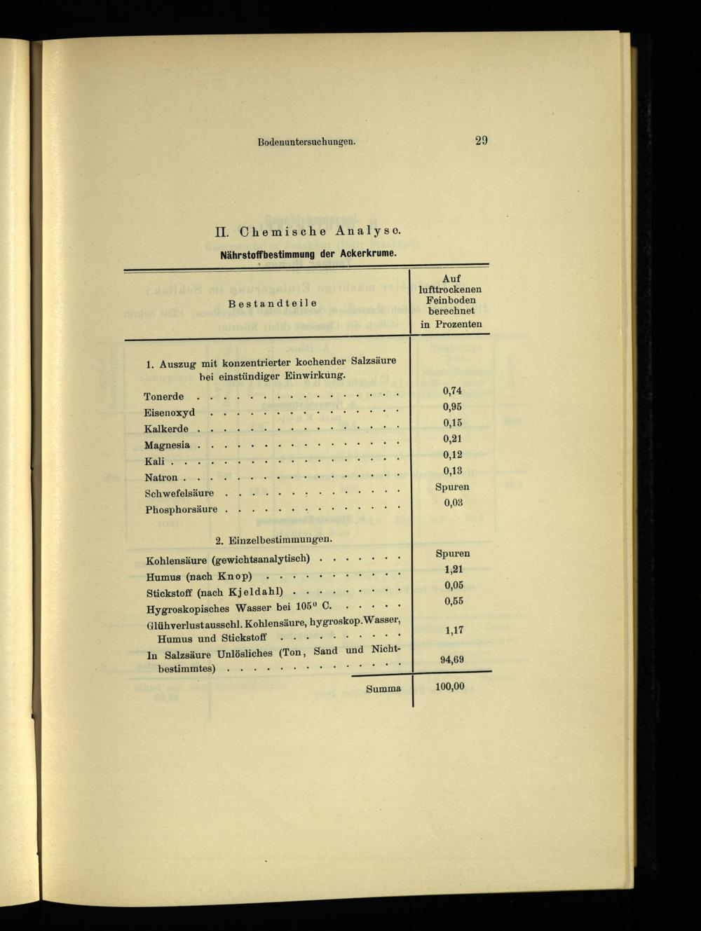 bei einstündiger Einwirkung. Tonerde..0. 1 A Ale Gew ee Ze 0,74 Bisenoxyd... 0 HH 0,95 Kalkerde 1. 0,15 Magnesia.... 1. 2.0. 0000004 40H HH 0,21 Kali ENTE 0,12 N 0,13 Schwefelsäure... 10..... W0 ı Spuren Phosphorsäure. 0,03 2. Einzelbestimmungen. Spuren Humus(nach Knop); 1:21 Stickstoff(nach Kjeldahl)..+. tt 0,05 Hygroskopisches Wasser bei 105% C. 0,55