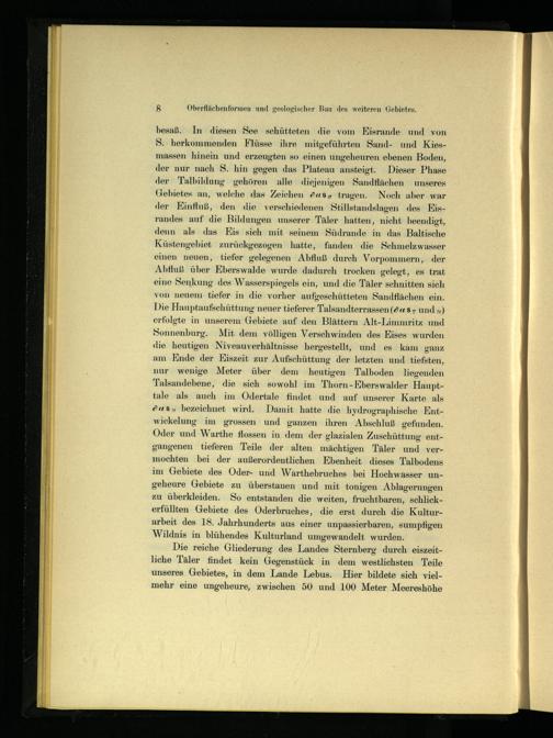 besaß. In diesen See schütteten die vom KEisrande. und von S. herkommenden Flüsse ihre mitgeführten Sand- und Kiesmassen hinein und erzeugten so einen ungeheuren ebenen Boden, der nur nach S. hin gegen das Plateau ansteigt. Dieser Phase der Talbildung gehören alle diejenigen Sandflächen unseres Gebietes an, welche das Zeichen dass t agen. Noch aber war der Einfluß, den die verschiedenen Stillstandslagen des KEis'andes auf die Bildungen unserer Täler hatten, nicht beendigt, denn als das Eis sich mit seinem Südrande in das Baltische Küstengebiet zurückgezogen hatte, fanden die Schmelzwasser einen neuen, tiefer gelegenen Abfluß durch Vorpommern, der Abfluß über Eberswalde wurde dadurch trocken gelegt, es trat eine Senkung des Wasserspiegels ein, und die Täler schnitten sich von neuem tiefer in die vorher aufgeschütteten Sandflächen ein. Die Hauptaufschüttung neuer tieferer Talsandterrassen(0«s- und v) erfolgte in unserem Gebiete auf den Blättern Alt-Limmritz und Sonnenburg. Mit dem völligen Verschwinden des Eises wurden die heutigen Niveauverhältnisse hergestellt, und es kam ganz am Ende der Eiszeit zur Aufschüttung der letzten und tiefsten, nur wenige Meter über dem heutigen Talboden liegenden Talsandebene, die sich sowohl im Thorn-Eberswalder Haupttale als auch im Odertale findet und auf unserer Karte als ö«s, bezeichnet wird. Damit hatte die hydrographische Entwickelung im grossen und ganzen ihren Abschluß gefunden. Oder und Warthe flossen in dem der glazialen Zuschüttung entgangenen tieferen Teile der alten mächtigen Täler und vermochten bei der außerordentlichen Ebenheit dieses Talbodens im Gebiete des Oder- und Warthebruches bei Hochwasser ungeheure Gebiete zu überstauen und mit tonigen Ablagerungen zu überkleiden. So entstanden die weiten, fruchtbaren, schlickerfüllten Gebiete des Oderbruches, die erst durch die Kulturarbeit des 18. Jahrhunderts aus einer unpassierbaren, sumpfigen Wildnis in blühendes Kulturland umgewandelt wurden.