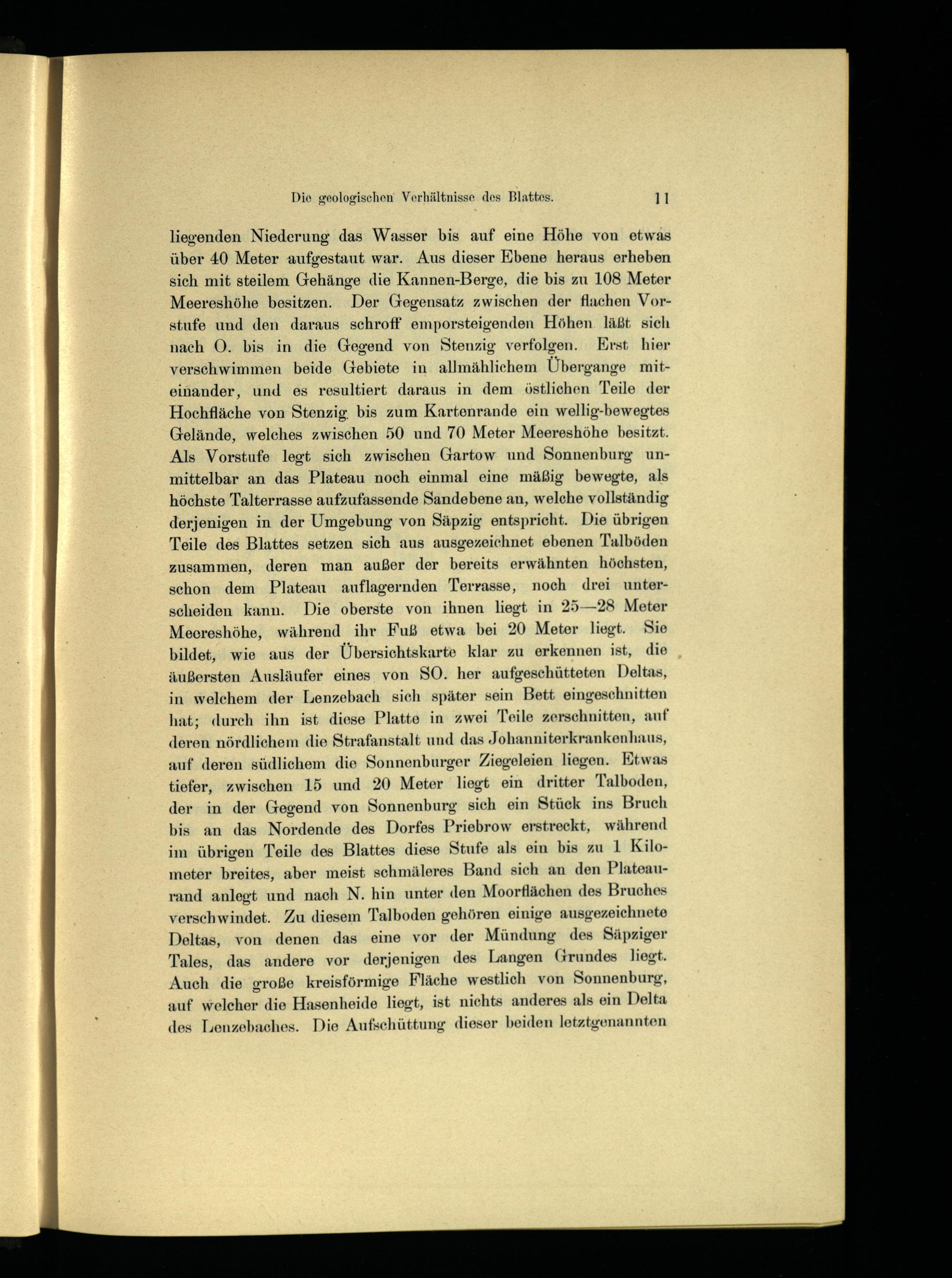 liegenden Niederung das Wasser bis auf eine Höhe von etwas über 40 Meter aufgestaut war. Aus dieser Ebene heraus erheben sich mit steilem Gehänge die Kannen-Berge, die bis zu 108 Meter Meereshöhe besitzen. Der Gegensatz zwischen der flachen Vorstufe und den daraus schroff emporsteigenden Höhen. läßt sich nach O. bis in die Gegend von Stenzig verfolgen. Krst hier verschwimmen beide Gebiete in allmählichem Übergange miteinander, und es resultiert daraus in dem östlichen Teile der Hochfläche von Stenzig. bis zum Kartenrande ein wellig-bewegtes Gelände, welches zwischen 50 und 70 Meter Meereshöhe besitzt. Als Vorstufe legt sich zwischen Gartow und Sonnenburg unmittelbar an das Plateau noch einmal eine mäßig bewegte, als höchste Talterrasse aufzufassende Sandebene an, welche vollständig derjenigen in der Umgebung von Säpzig entspricht. Die übrigen Teile des Blattes setzen sich aus ausgezeichnet ebenen Talböden zusammen, deren man außer der bereits erwähnten höchsten, schon dem Plateau auflagernden Terrasse, noch drei unterscheiden kann. Die oberste von ihnen liegt in 25—928 Meter Meecreshöhe, während ihr Fuß etwa bei 20 Meter liegt. Sie bildet, wie aus der Übersichtskarte klar zu erkennen ist, die äußersten Ausläufer eines von SO. her aufgeschütteten Deltas, in welchem der Lenzebach sich später sein Bett eingeschnitten hat; durch ihn ist diese Platte in zwei Teile zerschnitten, auf deren nördlichem die Strafanstalt und das Johanniterkrankenhaus, auf deren südlichem die Sonnenburger Ziegeleien liegen. Etwas tiefer, zwischen 15 und 20 Meter liegt ein dritter Talboden, der in der Gegend von Sonnenburg sich ein Stück ins Bruch bis an das Nordende des Dorfes Priebrow erstreckt, während im übrigen Teile des Blattes diese Stufe als ein bis zu 1 Kilometer breites, aber meist schmäleres Band sich an den Plateauand anlegt und nach N. hin unter den Moorflächen des Bruches verschwindet. Zu diesem Talboden gehören einige ausgezeichnete Deltas, von denen das eine vor der Mündung des Säpziger Tales, das andere vor derjenigen des Langen Grundes liegt. Auch die große kreisförmige Fläche westlich von Sonnenburg, auf welcher die Hasenheide liegt, ist nichts anderes als ein Delta des Lienzebaches. Die Aufschüttung dieser beiden letztgenannten