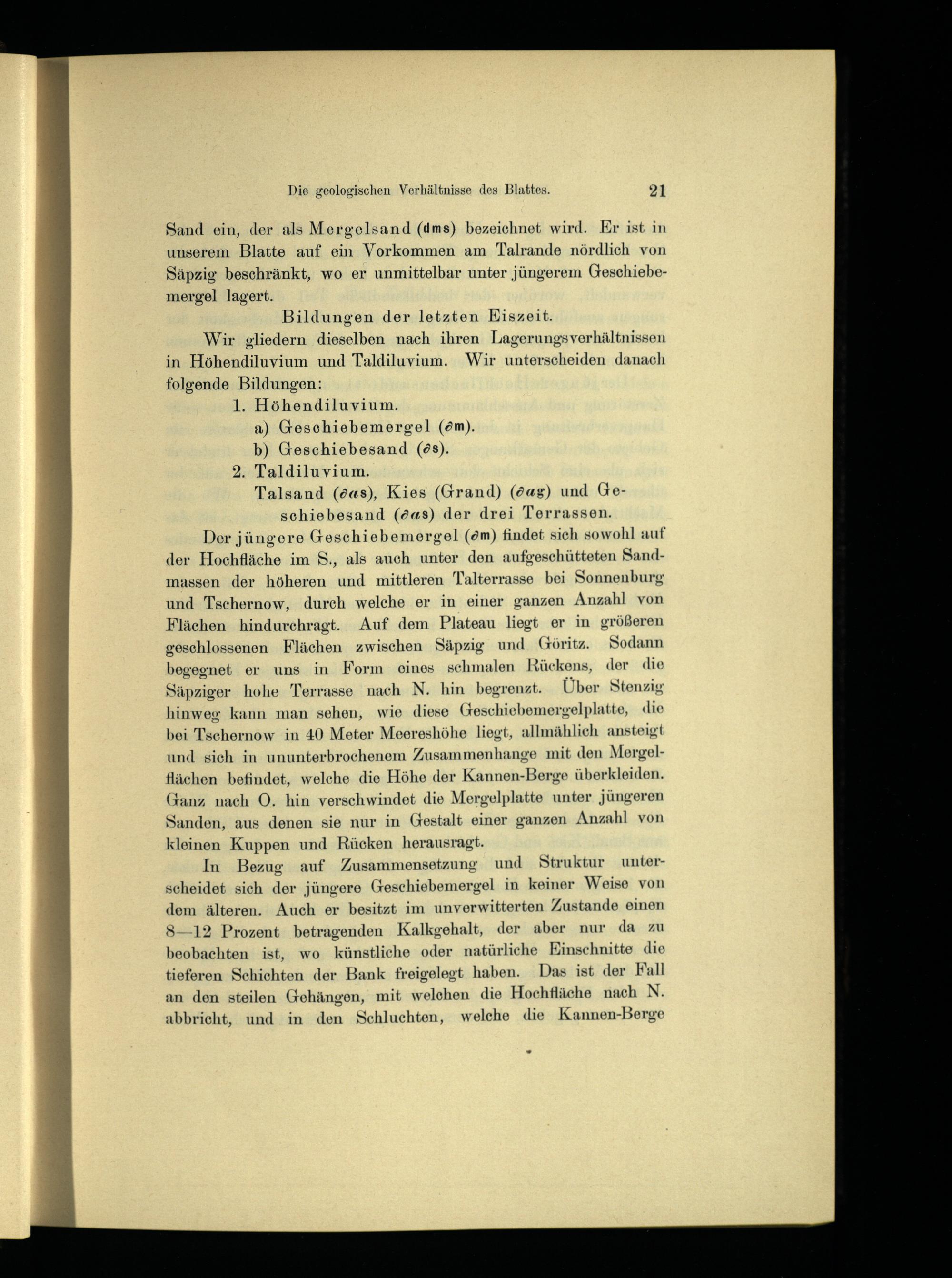 Sand ein, der als Mergelsand(dms) bezeichnet wird. Er ist in unserem Blatte auf ein Vorkommen am Talrande nördlich von Säpzig beschränkt, wo er unmittelbar unter jüngerem Geschiebemergel lagert.
