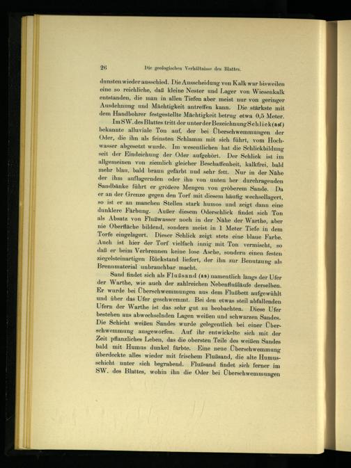 Im SW. des Blattes tritt der unterder Bezeichnung Schlick (ast) bekannte alluviale Ton auf, der bei Überschwemmungen der Oder, die ihn als feinsten Schlamm mit sich führt, vom Hochwasser abgesetzt wurde. Im wesentlichen hat die Schliekbildung seit der Eindeichung der Oder aufgehört. Der Schliek ist im allgemeinen von ziemlich gleicher Beschaffenheit, kalkfrei, bald mehr blau, bald braun gefärbt und sehr fett. Nur in der Nähe der ihm auflagernden oder ihn von unten her durchragenden Sandbänke führt er größere Mengen von gröberem Sande. Da er an der Grenze gegen den Torf mit diesem häufig wechsellagert, so ist er an manchen Stellen stark humos und zeigt dann eine dunklere Färbung. Außer diesem Oderschlick findet sich Ton als Absatz von Flußwasser noch in der Nähe der Warthe , aber nie Oberfläche bildend, sondern meist in 1 Meter Tiefe in dem Torfe eingelagert. Dieser Schlick zeigt stets eine blaue Farbe. Auch ist hier der Torf vielfach innig mit Ton vermischt, so daß er beim Verbrennen keine lose Asche, sondern einen festen ziegelsteinartigen Rückstand liefert, der ihn zur Benutzung als Brennmaterial unbrauchbar macht.