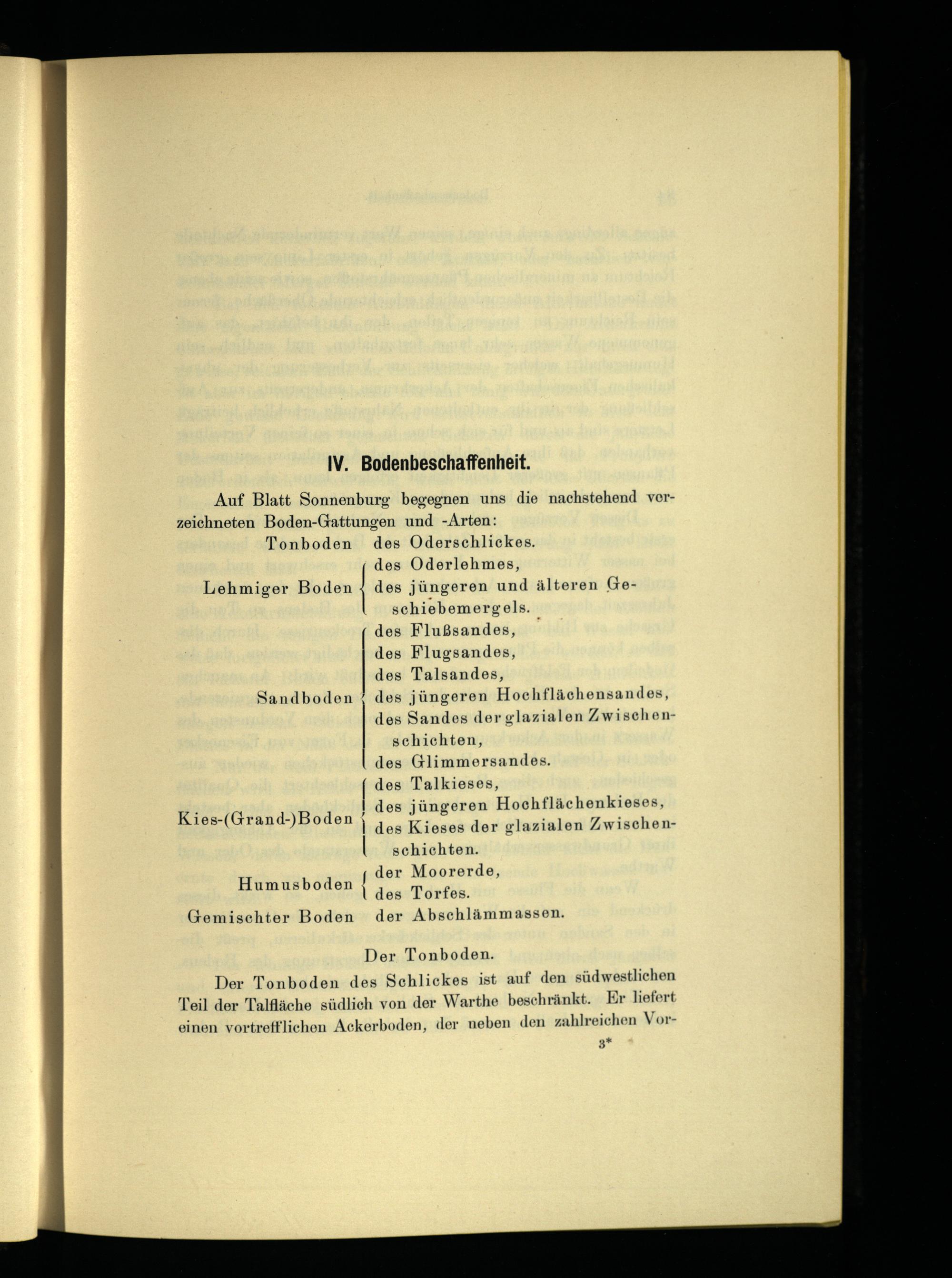 Auf Blatt Sonnenburg begegnen uns die nachstehend verzeichneten Boden-Gattungen und-Arten: Tonboden des Oderschlickes. des Oderlehmes, Lehmiger Boden{ des jüngeren und älteren Geschiebemergels. des Flußsandes, des Flugsandes, des Talsandes, Sandboden| des jüngeren Hochflächensandes, des Sandes der glazialen Zwischenschichten, des Glimmersandes., des Talkieses, des jüngeren Hochflächenkieses, des Kieses der glazialen Zwischen
