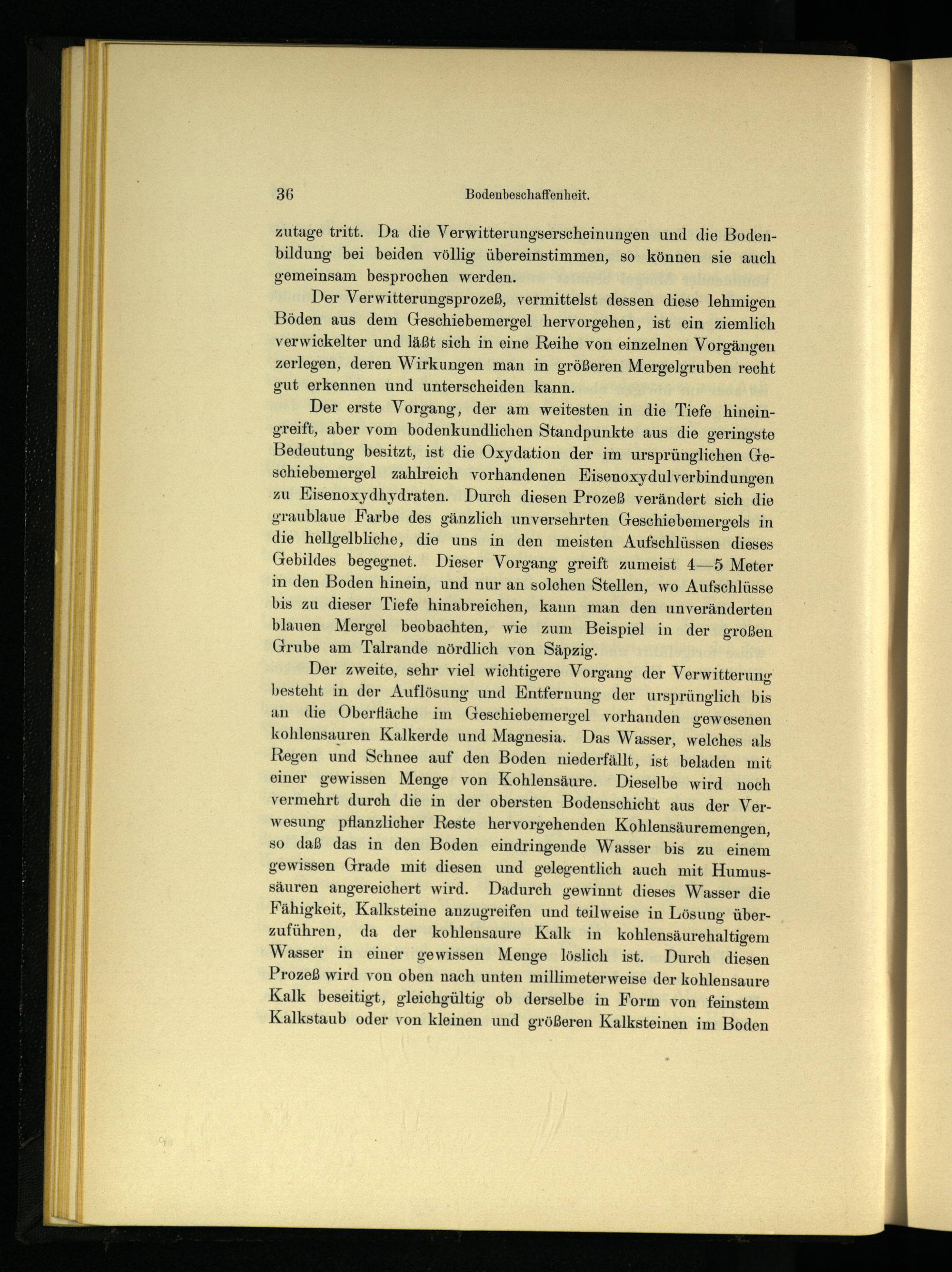 Der erste Vorgang, der am weitesten in die Tiefe hineingreift, aber vom bodenkundlichen Standpunkte aus die geringste Bedeutung besitzt, ist die Oxydation der im ursprünglichen Geschiebemergel zahlreich vorhandenen Kisenoxydulverbindungen zu Eisenoxydhydraten. Durch diesen Prozeß verändert sich die graublaue Farbe des gänzlich unversehrten Geschiebemergels in die hellgelbliche, die uns in den meisten Aufschlüssen dieses Gebildes begegnet. Dieser Vorgang greift zumeist 4—B5 Meter in den Boden hinein, und nur an solchen Stellen, wo Aufschlüsse bis zu dieser Tiefe hinabreichen, kann man den unveränderten blauen Mergel beobachten, wie zum Beispiel in der großen Grube am Talrande nördlich von Säpzig.
