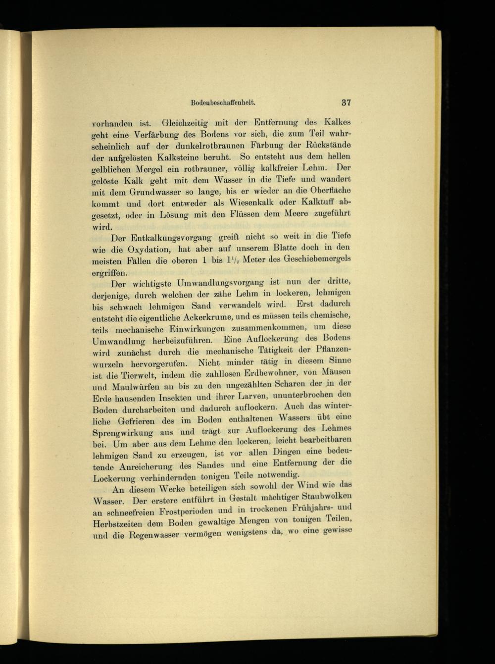 Der wichtigste Umwandlungsvorgang ist nun der dritte, derjenige, durch welchen der zähe Lehm in lockeren, lehmigen bis schwach lehmigen Sand verwandelt wird. Erst dadurch entsteht die eigentliche Ackerkrume, und es müssen teils chemische, teils mechanische Einwirkungen zusammenkommen, um diese Umwandlung herbeizuführen. Kine Auflockerung des Bodens wird zunächst durch die mechanische Tätigkeit der Pflanzenwurzeln hervorgerufen. Nicht minder tätig in diesem Sinne ist die Tierwelt, indem die zahllosen Erdbewohner, von Mäusen und. Maulwürfen an bis zu den ungezählten Scharen der in der Erde hausenden Insekten und ihrer Larven, ununterbrochen den Boden durcharbeiten und dadurch auflockern. Auch das winterliche Gefrieren des im Boden enthaltenen Wassers übt eine Sprengwirkung aus und trägt zur Auflockerung des Lehmes bei. Um aber aus dem Lehme den lockeren, leicht bearbeitbaren ist vor allen Dingen eine bedeu