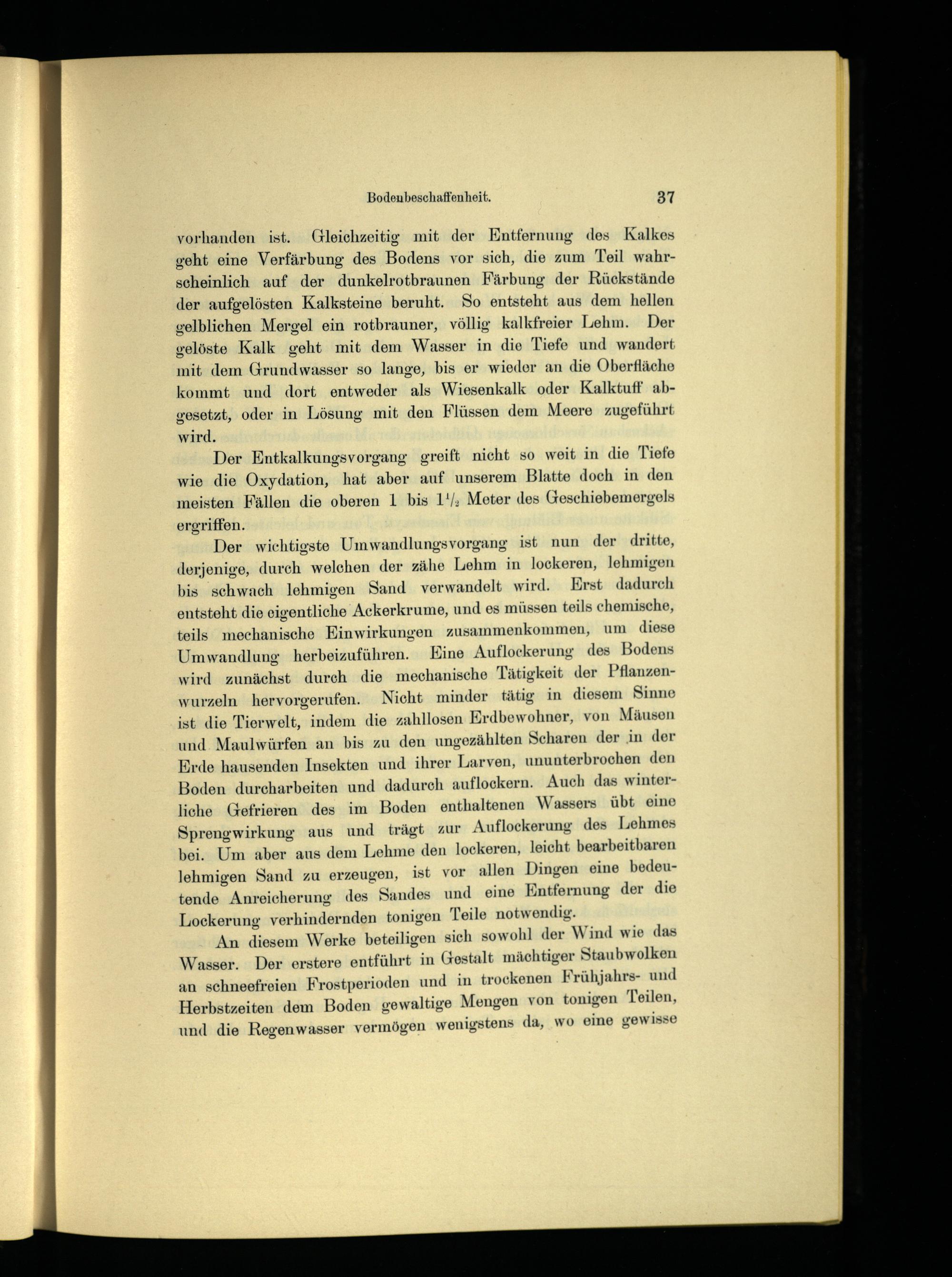 vorhanden ist. Gleichzeitig mit der Entfernung des Kalkes geht eine Verfärbung des Bodens vor sich, die zum Teil wahrscheinlich auf der dunkelrotbraunen Färbung der Rückstände der aufgelösten Kalksteine beruht. So entsteht aus dem hellen gelblichen Mergel ein rotbrauner, völlig kalkfreier Lehm. Der gelöste Kalk geht mit dem Wasser in die Tiefe und wandert mit dem Grundwasser so lange, bis er wieder an die Oberfläche kommt und dort entweder als Wiesenkalk oder Kalktuff abgesetzt, oder in Lösung mit den Flüssen dem Meere zugeführt wird.