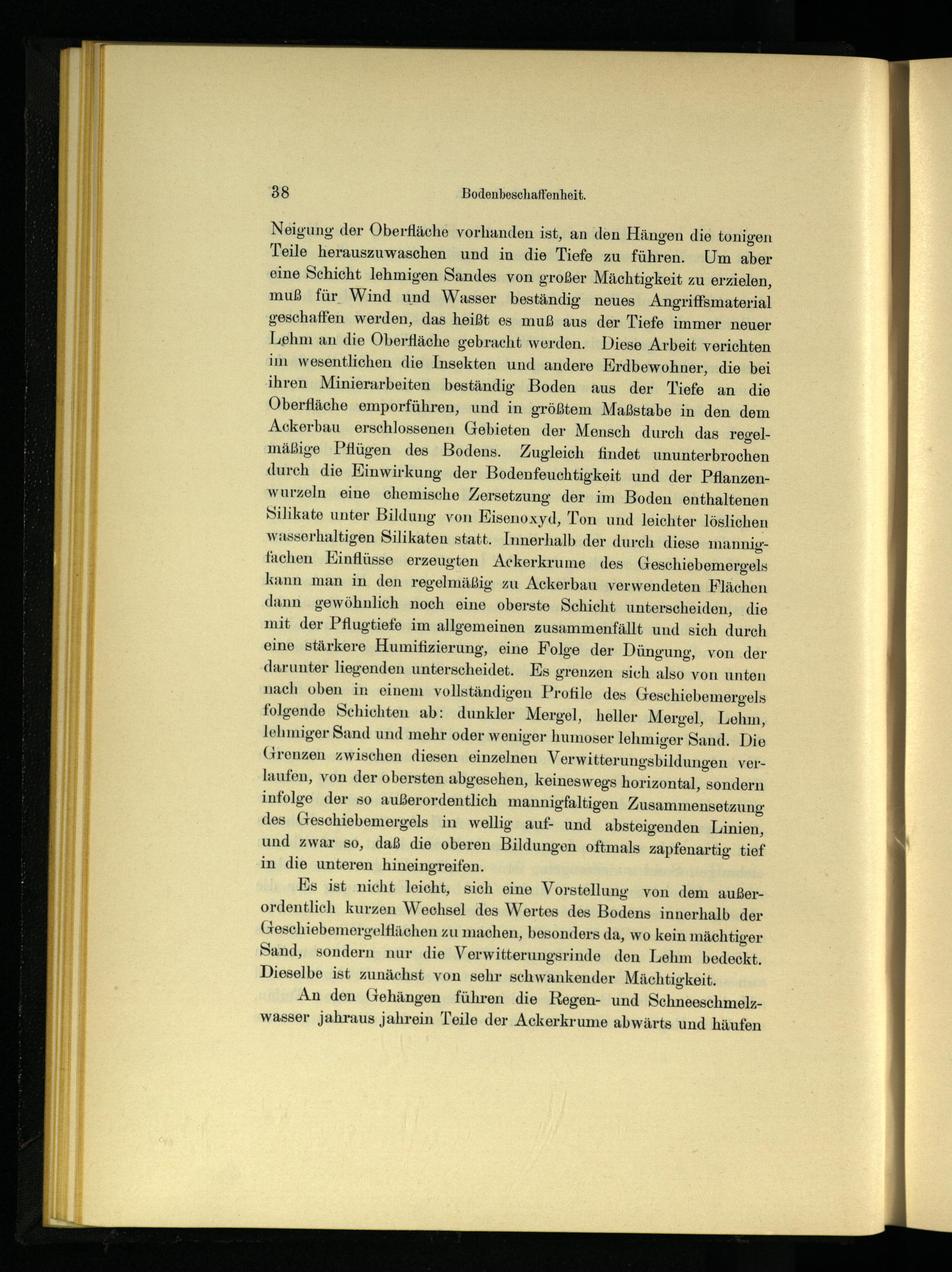 Neigung der Oberfläche vorhanden ist, an den Hängen die tonigen Teile herauszuwaschen und in die Tiefe zu führen. Um aber eine Schicht lehmigen Sandes von großer Mächtigkeit zu erzielen, muß für Wind und Wasser beständig neues Angriffsmaterial geschaffen werden, das heißt es muß aus der Tiefe immer neuer Lehm an die Oberfläche gebracht werden. Diese Arbeit verichten im wesentlichen die Insekten und andere Erdbewohner, die bei ihren Minierarbeiten beständig Boden aus der Tiefe an die Oberfläche emporführen, und in größtem Maßstabe in den dem Ackerbau erschlossenen Gebieten der Mensch durch das regelmäßige Pflügen des Bodens. Zugleich findet ununterbrochen durch die Einwirkung der Bodenfeuchtigkeit und der Pflanzenwurzeln eine chemische Zersetzung der im Boden enthaltenen Silikate unter Bildung von Eisenoxyd, Ton und leichter löslichen wasserhaltigen Silikaten statt. Innerhalb der durch diese mannigfachen Einflüsse erzeugten Ackerkrume des Geschiebemnergels kann man in den regelmäßig zu Ackerbau verwendeten Flächen dann gewöhnlich noch eine oberste Schicht unterscheiden, die mit der Pflugtiefe im allgemeinen zusammenfällt und sich durch eine stärkere Humifizierung, eine Folge der Düngung, von der darunter liegenden unterscheidet. Es grenzen sich also von unten nach oben in einem vollständigen Profile des Geschiebemergels folgende Schichten ab: dunkler Mergel, heller Mergel, Lehm, lehmiger Sand und mehr oder weniger humoser lehmiger Sand. Die Grenzen zwischen diesen einzelnen Verwitter'ungsbildungen verlaufen, von der obersten abgesehen, keineswegs horizontal, sondern infolge der so außerordentlich mannigfaltigen Zusammensetzung des Geschiebemer gels in wellig auf- und absteigenden Linien, und zwar so, daß die oberen Bildungen oftmals zapfenartig tief in die unteren hineingreifen.