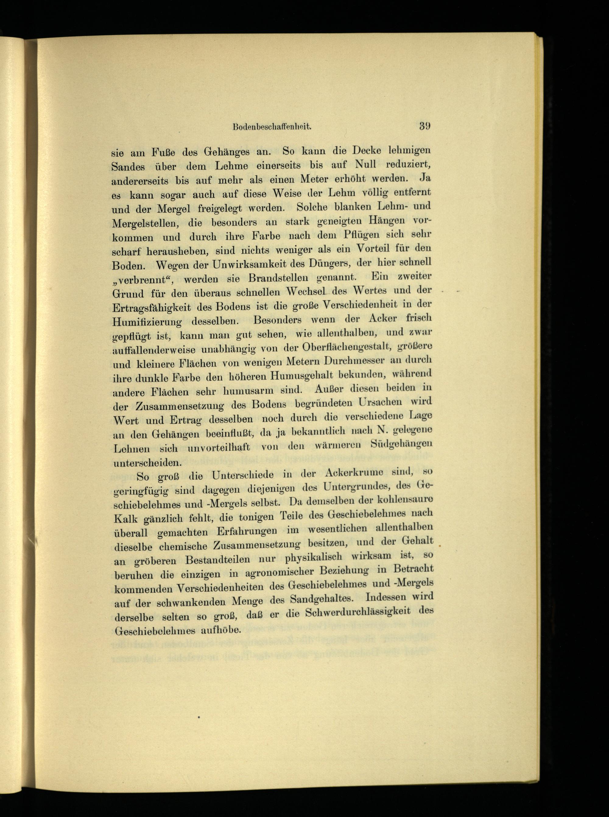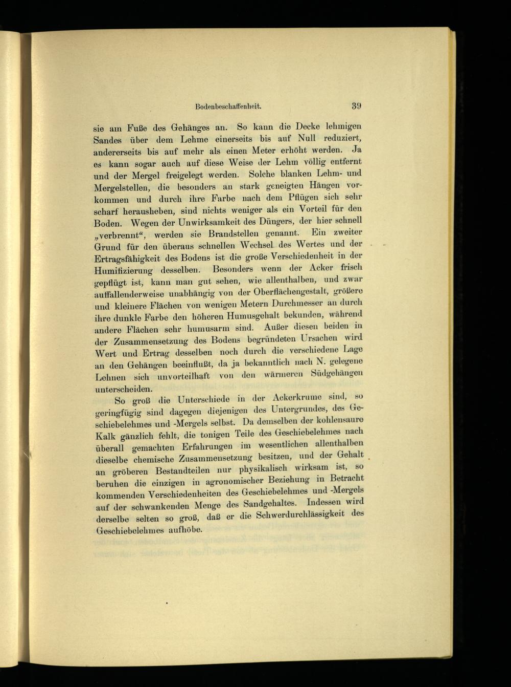 sie am Fuße des Gehänges an. So kann die Decke lehmigen Sandes über dem Lehme einerseits bis auf Null reduziert, andererseits bis auf mehr als einen Meter erhöht werden. Ja es kann sogar auch auf diese Weise der Lehm völlig entfernt und der Mergel freigelegt werden. Solche blanken Lehm- und Mergelstellen, die besonders an stark geneigten Hängen vorkommen und durch ihre Farbe nach dem Pflügen sich sehr scharf herausheben, sind nichts weniger als ein Vorteil für den Boden. Wegen der Unwirksamkeit des Düngers, der hier schnell „verbrennt“, werden sie Brandstellen genannt. Kin zweiter Grund für den überaus schnellen Wechsel des Wertes und der Ertragsfähigkeit des Bodens ist die große Verschiedenheit in der Humifizierung desselben. Besonders wenn der Acker frisch gepflügt ist, kann man gut sehen, wie allenthalben, und zwar auffallenderweise unabhängig von der Oberflächengestalt, größere und Kleinere Flächen von wenigen Metern Durchmesser an durch ihre dunkle Farbe den höheren Humusgehalt bekunden, während andere Flächen sehr humusarm sind. Außer diesen beiden in der Zusammensetzung des Bodens begründeten Ursachen wird Wert und Ertrag desselben noch durch die verschiedene Lage an den Gehängen beeinflußt, da ja bekanntlich nach N. gelegene Lehnen sich unvorteilhaft von den wärmeren Südgehängen unterscheiden.