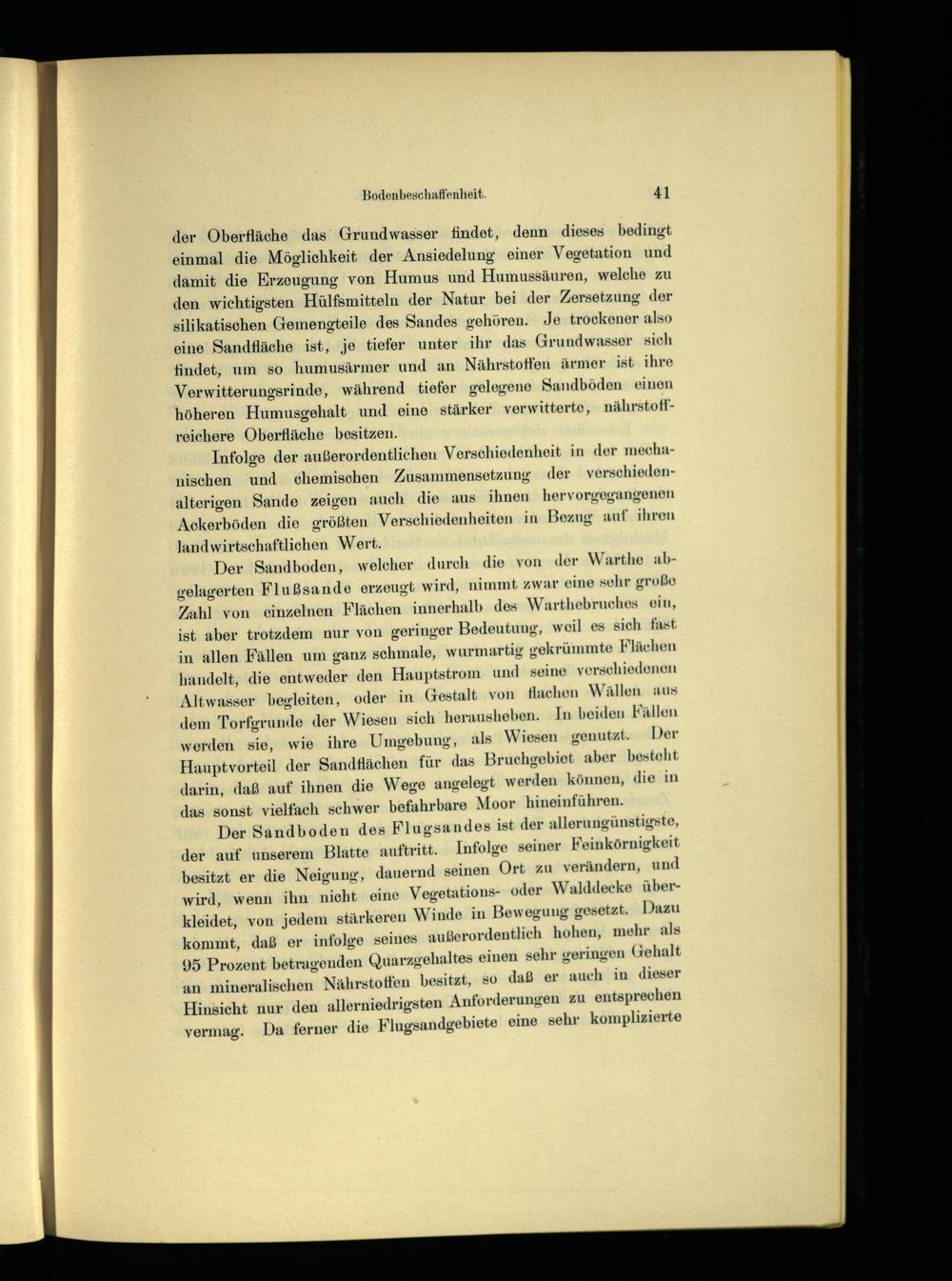 Der Sandboden des Flugsandes ist der allerungünstigste, der auf unserem Blatte auftritt. Infolge seiner Feinkörnigkeit besitzt er die Neigung, dauernd seinen Ort zu verändern, und wird, wenn ihn nicht eine Vegetations- oder Walddecke überkleidet, von jedem stärkeren Winde in Bewegung gesetzt. Dazu kommt, daß er infolge seines außerordentlich hohen, mehr als 95 Prozent betragenden Quarzgehaltes einen sehr geringen Gehalt an mineralischen Nährstoffen besitzt, so daß er auch in dieser Hinsicht nur den allerniedrigsten Anforderungen zu entsprechen