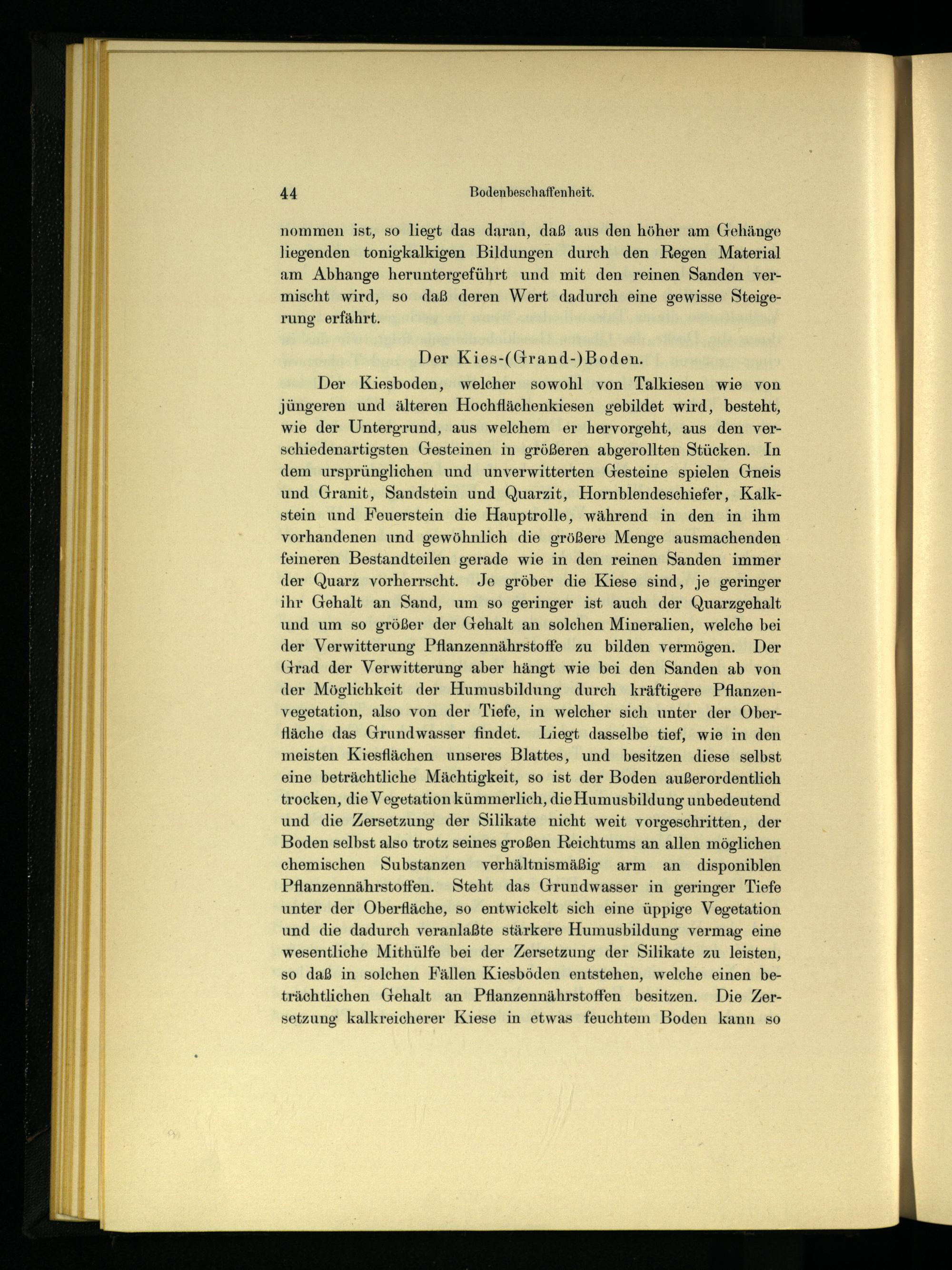 Der Kiesboden, welcher sowohl von Talkiesen wie von jüngeren und älteren Hochflächenkiesen gebildet wird, besteht, wie der Untergrund, aus welchem er hervorgeht, aus den verschiedenartigsten Gesteinen in größeren abgerollten Stücken. In dem ursprünglichen und unverwitterten Gesteine spielen Gneis und Granit, Sandstein und Quarzit, Hornblendeschiefer, Kalkstein und Feuerstein die Hauptrolle, während in den in ihm vorhandenen und gewöhnlich die größere Menge ausmachenden feineren Bestandteilen gerade wie in den reinen Sanden immer der Quarz vorherrscht. Je gröber die Kiese sind, je geringer ihr Gehalt an Sand, um so geringer ist auch der Quarzgehalt und um so größer der Gehalt an solchen Mineralien, welche bei der Verwitterung Pflanzennährstoffe zu bilden vermögen. Der Grad der Verwitterung aber hängt wie bei den Sanden ab von der Möglichkeit der Humusbildung durch kräftigere Pflanzenvegetation, also von der Tiefe, in welcher sich unter der Oberfläche das Grundwasser findet. Liegt dasselbe tief, wie in den meisten Kiesflächen unseres Blattes, und besitzen diese selbst eine beträchtliche Mächtigkeit, so ist der Boden außerordentlich trocken, die Vegetation kümmerlich, die Humusbildung unbedeutend und die Zersetzung der Silikate nicht weit vorgeschritten, der Boden selbst also trotz seines großen Reichtums an allen möglichen chemischen Substanzen verhältnismäßig arm an disponiblen Pflanzennährstoffen. Steht das Grundwasser in geringer Tiefe unter der Oberfläche, so entwickelt sich eine üppige Vegetation und die dadurch veranlaßte stärkere Humusbildung vermag eine wesentliche Mithülfe bei der Zersetzung der Silikate zu leisten, so daß in solchen Fällen Kiesböden entstehen, welche einen beträchtlichen Gehalt an Pflanzennährstoffen besitzen. Die Zersetzung kalkreicherer Kiese in etwas feuchtem Boden kann so