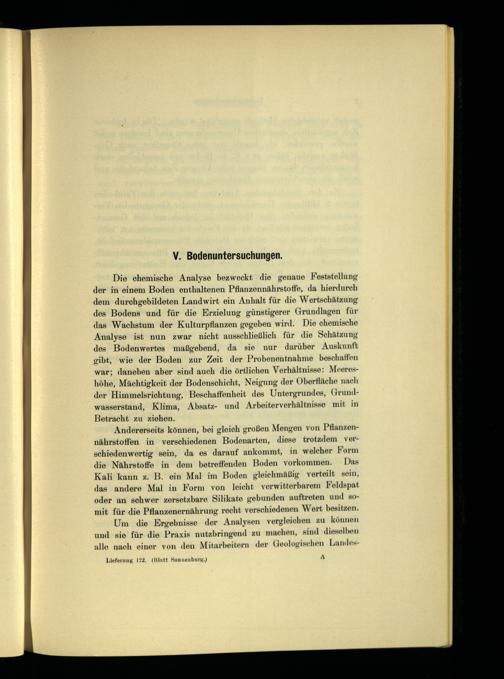 Die chemische Analyse bezweckt die genaue Feststellung der in einem Boden enthaltenen Pflanzennährstoffe, da hierdurch dem durchgebildeten Landwirt ein Anhalt für die Wertschätzung des Bodens und für die Erzielung günstigerer Grundlagen für das Wachstum der Kulturpflanzen gegeben wird. Die chemische Analyse ist nun zwar nicht ausschließlich für die Schätzung des Bodenwertes maßgebend, da sie nur darüber Auskunft gibt, wie der Boden zur Zeit der Probenentnahme beschaffen war; daneben aber sind auch die örtlichen Verhältnisse: Meereshöhe, Mächtigkeit der Bodenschicht, Neigung der Oberfläche nach der Himmelsrichtung, Beschaffenheit des Untergrundes,( jrundwasserstand, Klima, Absatz- und Arbeiterverhältnisse mit in Betracht zu ziehen.