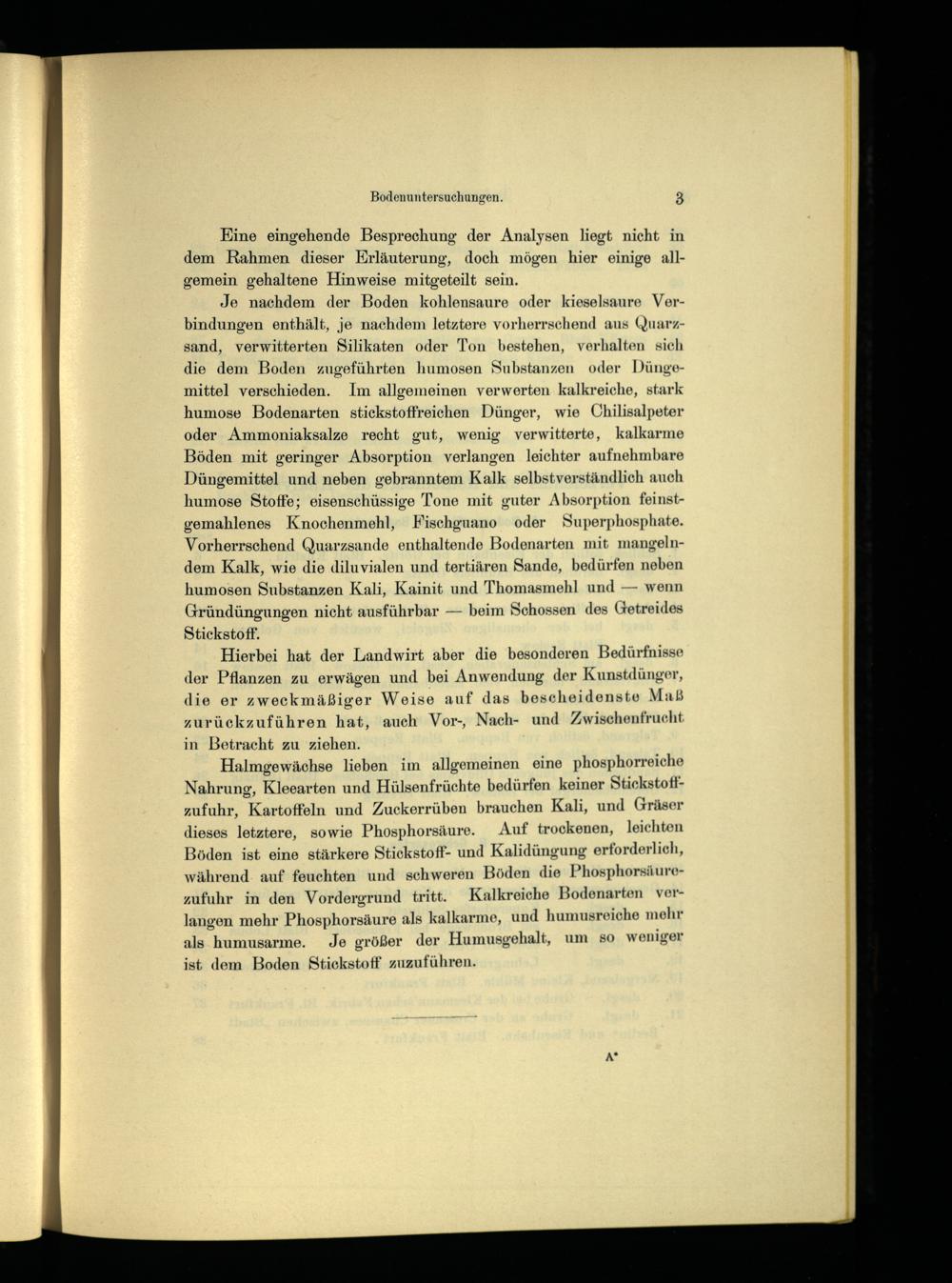 humose Bodenarten stickstoffreichen Dünger, wie Chilisalpeter oder Ammoniaksalze recht gut, wenig verwitterte, kalkarme Böden mit geringer Absorption verlangen leichter aufnehmbare Düngemittel und neben gebranntem Kalk selbstverständlich auch humose Stoffe; eisenschüssige Tone mit guter Absorption feinstgemahlenes Knochenmehl, Fischguano oder Superphosphate. Vorherrschend Quarzsande enthaltende Bodenarten mit mangelndem Kalk, wie die diluvialen und tertiären Sande, bedürfen neben humosen Substanzen Kali, Kainit und Thomasmehl und— wenn Gründüngungen nicht ausführbar— beim Schossen des Getreides Stickstoff.