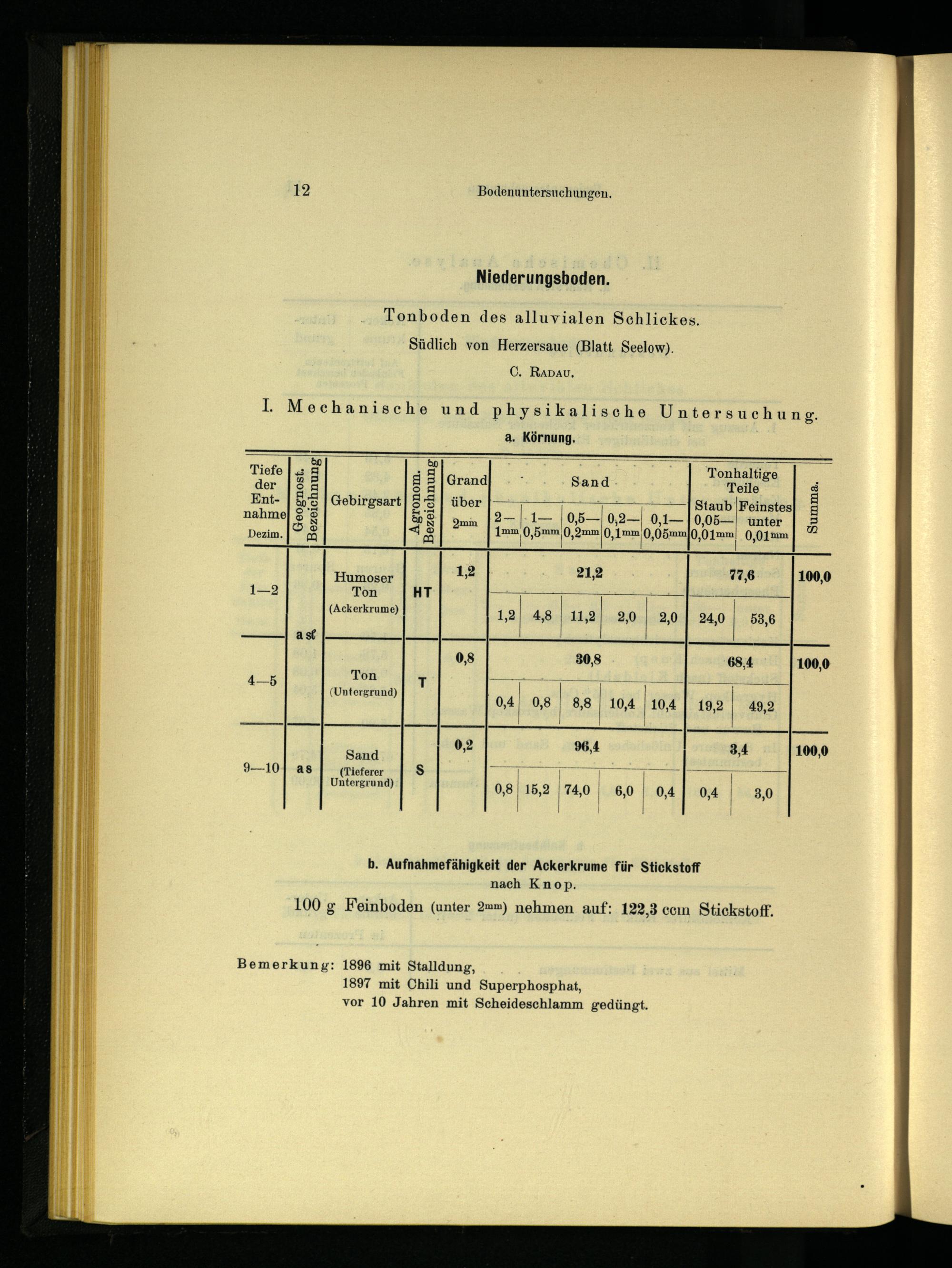 100 g Feinboden(unter 2=m) nehmen auf: 122,3 ccm Stickstoff.