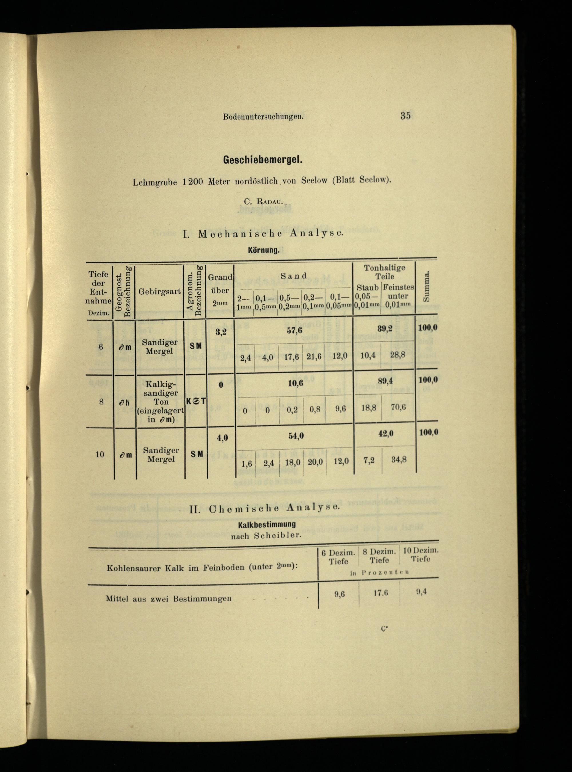 Kalkbestimmung nach Scheibler. 6 Dezim. 8 Dezim. 10 Dezim. Kohlensaurer Kalk im Feinboden(unter 2mm): Tiefe Tief eit in Prozenten
