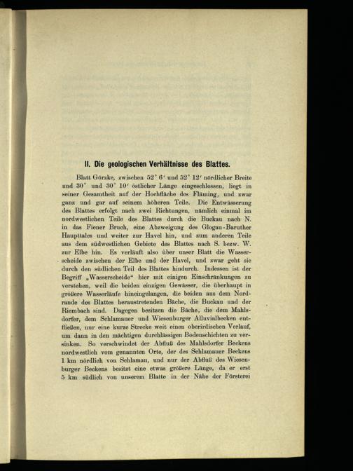 Blatt Görzke , zwischen 52° 6‘ und 52° 12‘ nördlicher Breite und 30° und 30° 10‘ östlicher Länge eingeschlossen, liegt in seiner Gesamtheit auf der Hochfläche des Fläming, und zwar ganz und gar auf seinem höheren Teile. Die Entwässerung des Blattes erfolgt nach zwei Richtungen, nämlich einmal im nordwestlichen Teile des Blattes durch die Buckau nach N. in das Fiener Bruch, eine Abzweigung des Glogau -Baruther Haupttales und weiter zur Havel hin, und zum anderen Teile aus dem südwestlichen Gebiete des Blattes nach S. bezw. W. zur Elbe hin. Es verläuft also über unser Blatt die Wasser- scheide zwischen der Elbe und der Havel , und zwar geht sie durch den südlichen Teil des Blattes hindurch. Indessen ist der Begriff„Wasserscheide“ hier mit einigen Kinschränkungen zu verstehen, weil die beiden einzigen Gewässer, die überhaupt in größere Wasserläufe hineingelangen, die beiden aus dem Nordrande des Blattes heraustretenden Bäche, die Buckau und der Riembach sind. Dagegen besitzen die Bäche, die dem Mahlsdorfer, dem Schlamauer und Wiesenburger Alluvialbecken entfließen, nur eine kurze Strecke weit einen oberirdischen Verlauf, um dann in den mächtigen durchlässigen Bodenschichten zu versinken. So verschwindet der Abfluß des Mahlsdurfer Beckens nordwestlich vom genannten Orte, der des Schlamauer Beckens 1 km nördlich von Schlamau, und nur der Abfluß des Wiesen burger Beckens besitzt eine etwas größere Länge, da er erst 5 km südlich von unserem Blatte in der Nähe der Försterei