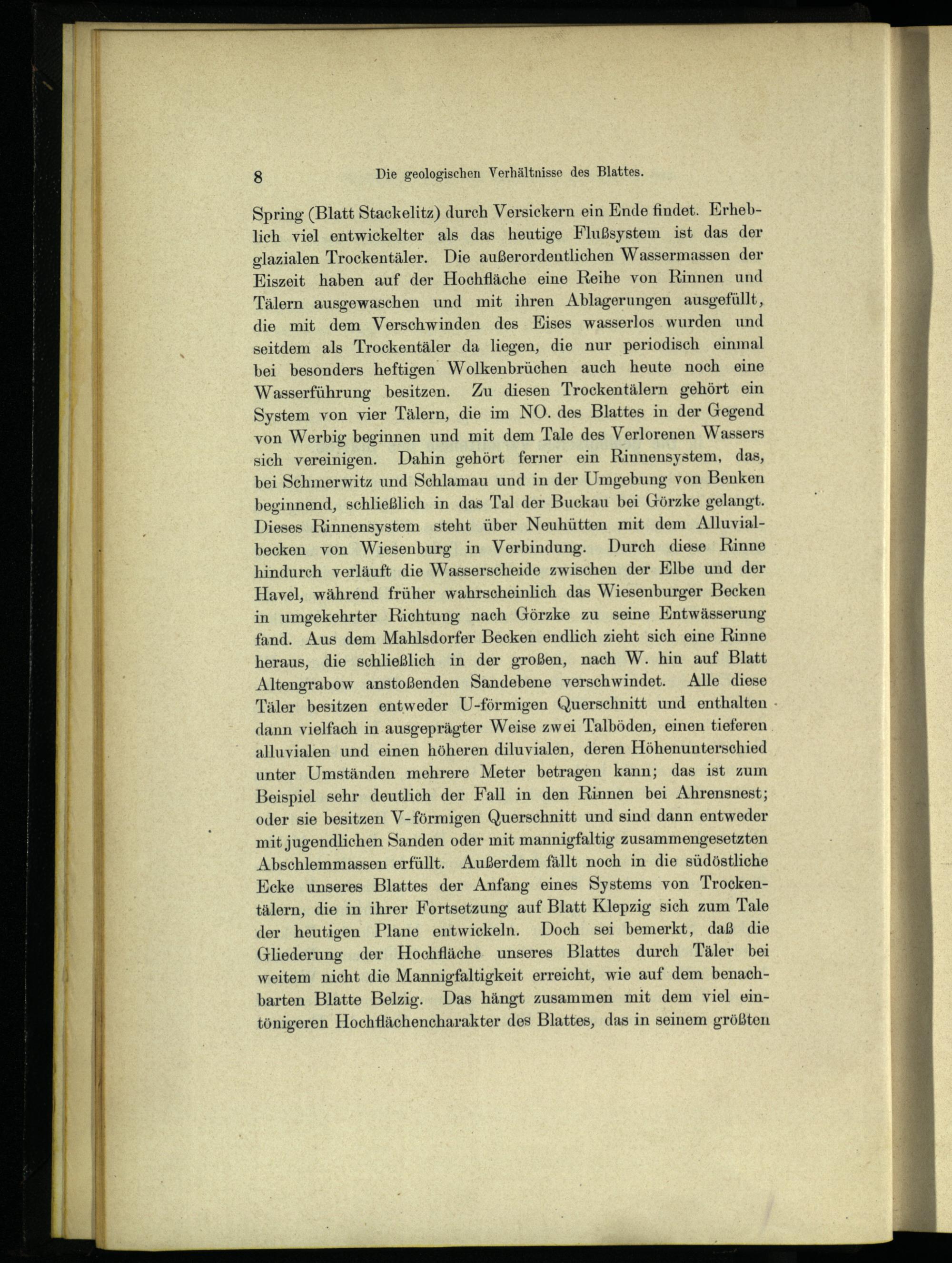 Spring(Blatt Stackelitz) durch Versickern ein Ende findet. Erheblich viel entwickelter als das heutige Flußsystem ist das der glazialen Trockentäler. Die außerordentlichen Wassermassen der Eiszeit haben auf der Hochfläche eine Reihe von Rinnen und Tälern ausgewaschen und mit ihren Ablagerungen ausgefüllt, die mit dem Verschwinden des KEises wasserlos wurden und seitdem als Trockentäler da liegen, die nur periodisch einmal bei besonders heftigen Wolkenbrüchen auch heute noch eine Wasserführung besitzen. Zu diesen Trockentälern gehört ein System von vier Tälern, die im NO. des Blattes in der Gegend von Werbig beginnen und mit dem Tale des Verlorenen Wassers sich vereinigen. Dahin gehört ferner ein Rinnensystem, das, bei Schmerwitz und Schlamau und in der Umgebung von Benken beginnend, schließlich in das Tal der Buckau bei Görzke gelangt. Dieses Rinnensystem steht über Neuhütten mit dem Alluvialbecken von Wiesenburg in Verbindung. Durch diese Rinne hindurch verläuft die Wasserscheide zwischen der Elbe und der Havel , während früher wahrscheinlich das Wiesenburger Becken in umgekehrter Richtung nach Görzke zu seine Entwässerung fand. Aus dem Mahlsdorfer Becken endlich zieht sich eine Rinne heraus, die schließlich in der großen, nach W. hin auf Blatt
