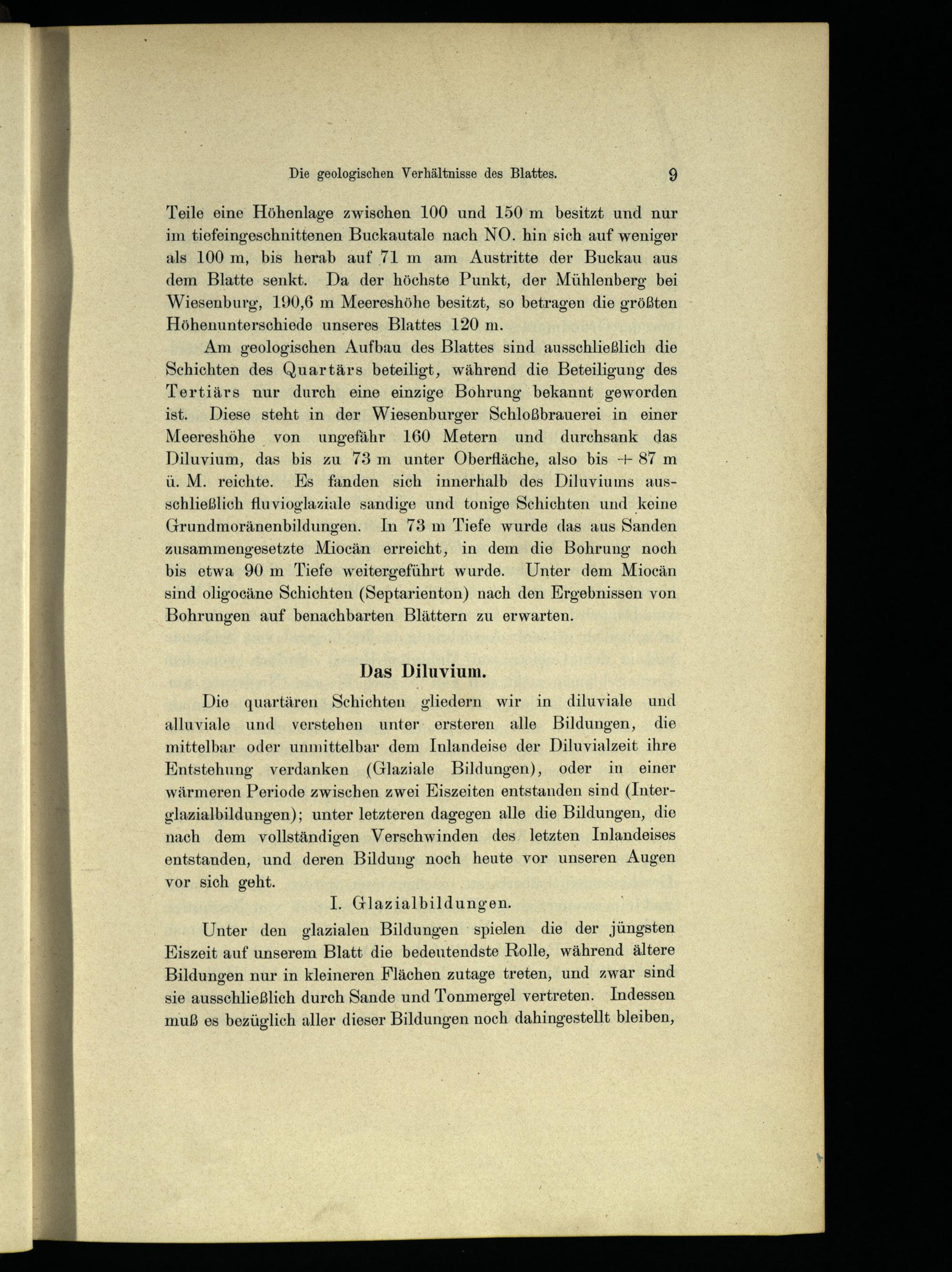 Die quartären Schichten gliedern wir in diluviale und alluviale und verstehen unter ersteren alle Bildungen, die mittelbar oder unmittelbar dem Inlandeise der Diluvialzeit ihre Entstehung verdanken(Glaziale Bildungen), oder in einer wärmeren Periode zwischen zwei Eiszeiten entstanden sind(Interglazialbildungen); unter letzteren dagegen alle die Bildungen, die nach dem vollständigen Verschwinden des letzten Inlandeises entstanden, und deren Bildung noch heute vor unseren Augen vor sich geht. I. Glazialbildungen.