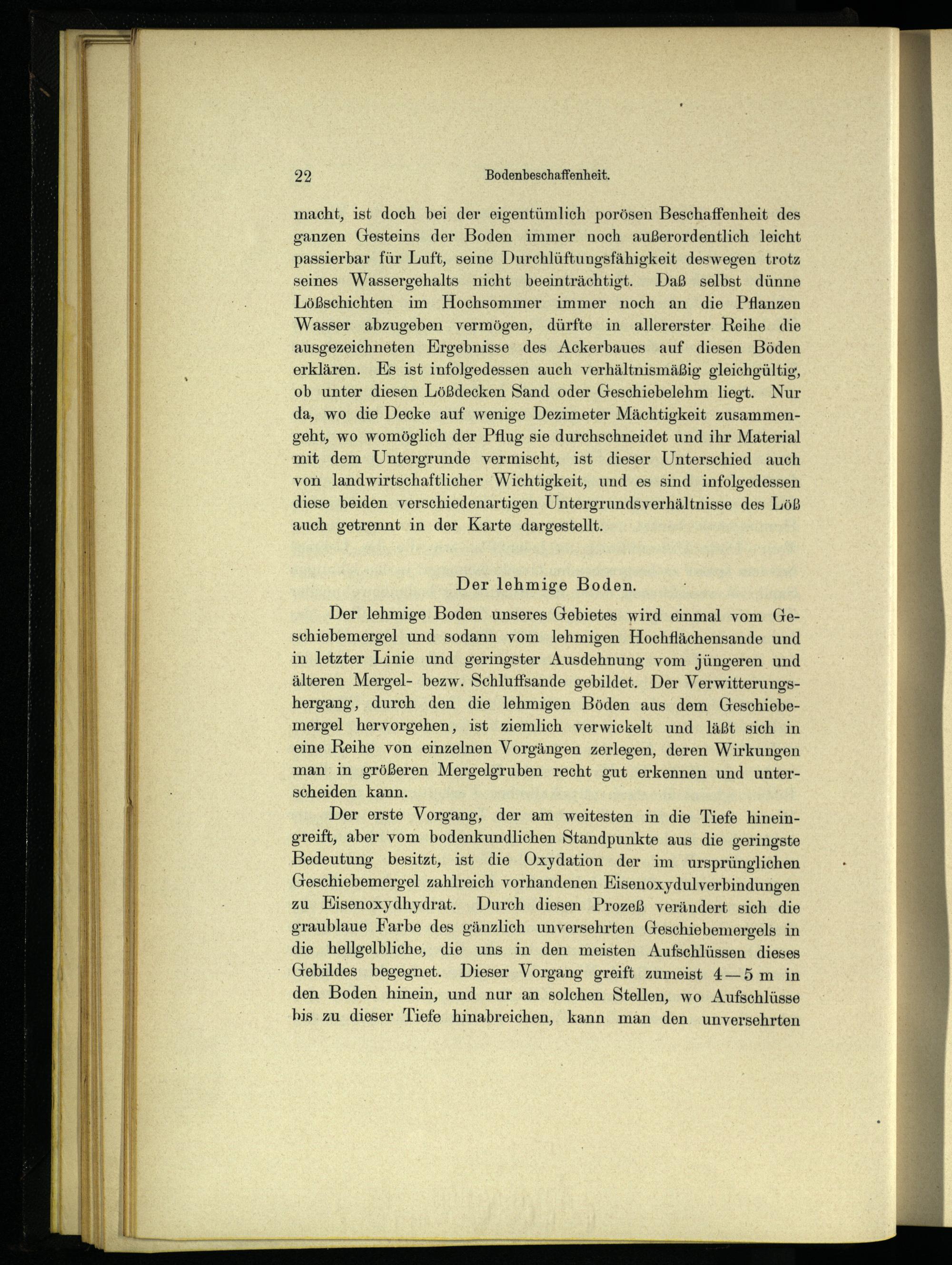 Der erste Vorgang, der am weitesten in die Tiefe hineingreift, aber vom bodenkundlichen Standpunkte aus die geringste Bedeutung besitzt, ist die Oxydation der im ursprünglichen Geschiebemergel zahlreich vorhandenen Kisenoxydulverbindungen zu KEisenoxydhydrat. Durch diesen Prozeß verändert sich die graublaue Farbe des gänzlich unversehrten Geschiebemergels in die hellgelbliche, die uns in den meisten Aufschlüssen dieses Gebildes begegnet. Dieser Vorgang greift zumeist 4—5 m in den Boden hinein, und nur an solchen Stellen, wo Aufschlüsse his zu dieser Tiefe hinabreichen, kann män den unversehrten