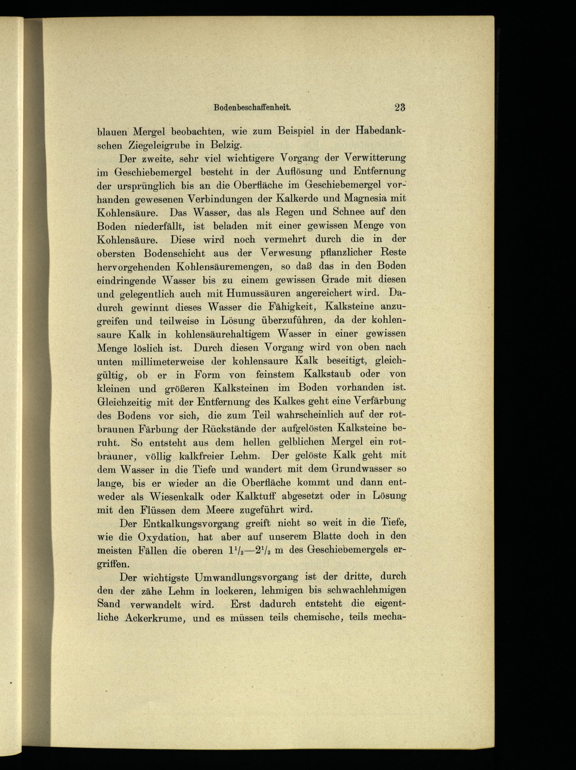 Der zweite, sehr viel wichtigere Vorgang der Verwitterung im Geschiebemergel besteht in der Auflösung und Entfernung der ursprünglich bis an die Oberfläche im Geschiebemergel vorhanden gewesenen Verbindungen der Kalkerde und Magnesia mit Kohlensäure. Das Wasser, das als Regen und Schnee auf den Boden niederfällt, ist beladen mit einer gewissen Menge von Kohlensäure. Diese wird noch vermehrt durch die in der obersten Bodenschicht aus der Verwesung pflanzlicher Reste hervorgehenden Kohlensäuremengen, so daß das in den Boden eindringende Wasser bis zu einem gewissen Grade mit diesen und gelegentlich auch mit Humussäuren angereichert wird. Dadurch gewinnt dieses Wasser die Fähigkeit, Kalksteine anzugreifen und teilweise in Lösung überzuführen, da der kohlensaure Kalk in kohlensäurehaltigem Wasser in einer gewissen Menge löslich ist. Durch diesen Vorgang wird von oben nach unten millimeterweise der kohlensaure Kalk beseitigt, gleichgültig, ob er in Form von feinstem Kalkstaub oder von kleinen und größeren Kalksteinen im Boden vorhanden ist. Gleichzeitig mit der Entfernung des Kalkes geht eine Verfärbung des Bodens vor sich, die zum Teil wahrscheinlich auf der rotbraunen Färbung der Rückstände der aufgelösten Kalksteine beruht. So entsteht aus dem hellen gelblichen Mergel ein rotbrauner, völlig kalkfreier Lehm. Der gelöste Kalk geht mit dem Wasser in die Tiefe und wandert mit dem Grundwasser so lange, bis er wieder an die Oberfläche kommt und dann entweder als Wiesenkalk oder Kalktuff abgesetzt oder in Lösung mit den Flüssen dem Meere zugeführt wird.