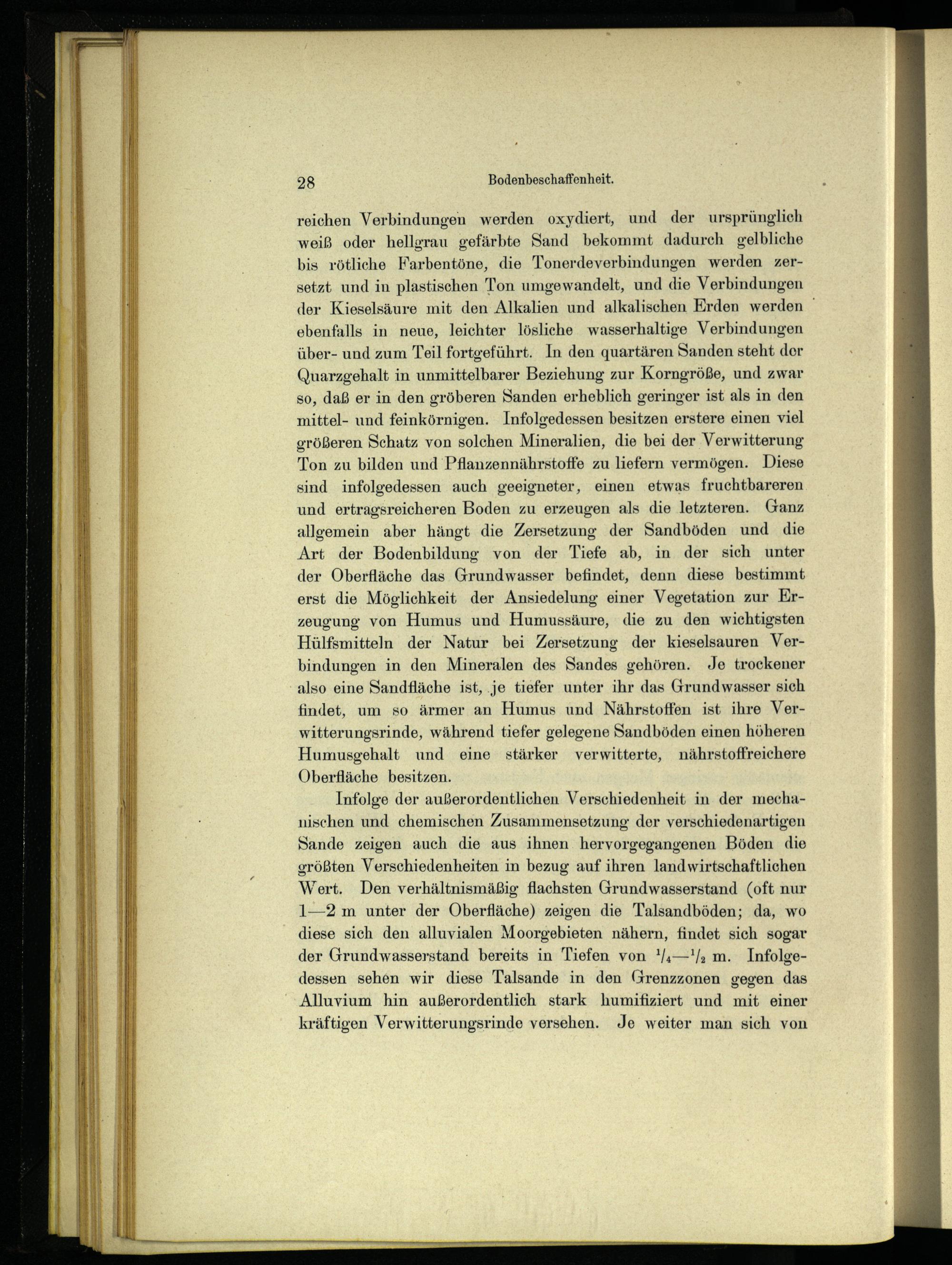 reichen Verbindungen werden oxydiert, und der ursprünglich weiß oder hellgrau gefärbte Sand bekommt dadurch gelbliche bis rötliche Farbentöne, die Tonerdeverbindungen werden zersetzt. und in plastischen Ton umgewandelt, und die Verbindungen der Kieselsäure mit den Alkalien und alkalischen Erden werden ebenfalls in neue, leichter lösliche wasserhaltige Verbindungen über- und zum Teil fortgeführt. In den quartären Sanden steht dor Quarzgehalt in unmittelbarer Beziehung zur Korngröße, und zwar so, daß er in den gröberen Sanden erheblich geringer ist als in den mittel- und feinkörnigen. Infolgedessen besitzen erstere einen viel größeren Schatz von solchen Mineralien, die bei der Verwitterung Ton zu bilden und Pflanzennährstoffe zu liefern vermögen. Diese sind infolgedessen auch geeigneter, einen etwas fruchtbareren und ertragsreicheren Boden zu erzeugen als die letzteren. Ganz allgemein aber hängt die Zersetzung der Sandböden und die Art der Bodenbildung von der Tiefe ab, in der sich unter der Oberfläche das Grundwasser befindet, denn diese bestimmt erst die Möglichkeit der Ansiedelung einer Vegetation zur Erzeugung von Humus und Humussäure, die zu den wichtigsten Hülfsmitteln der Natur bei Zersetzung der kieselsauren Verbindungen in den Mineralen des Sandes gehören. Je trockener also eine Sandfläche ist,.je tiefer unter ihr das Grundwasser sich findet, um so ärmer an Humus und Nährstoffen ist ihre Verwitterungsrinde, während tiefer gelegene Sandböden einen höheren Humusgehalt und eine stärker verwitterte, nährstoffreichere Oberfläche besitzen.