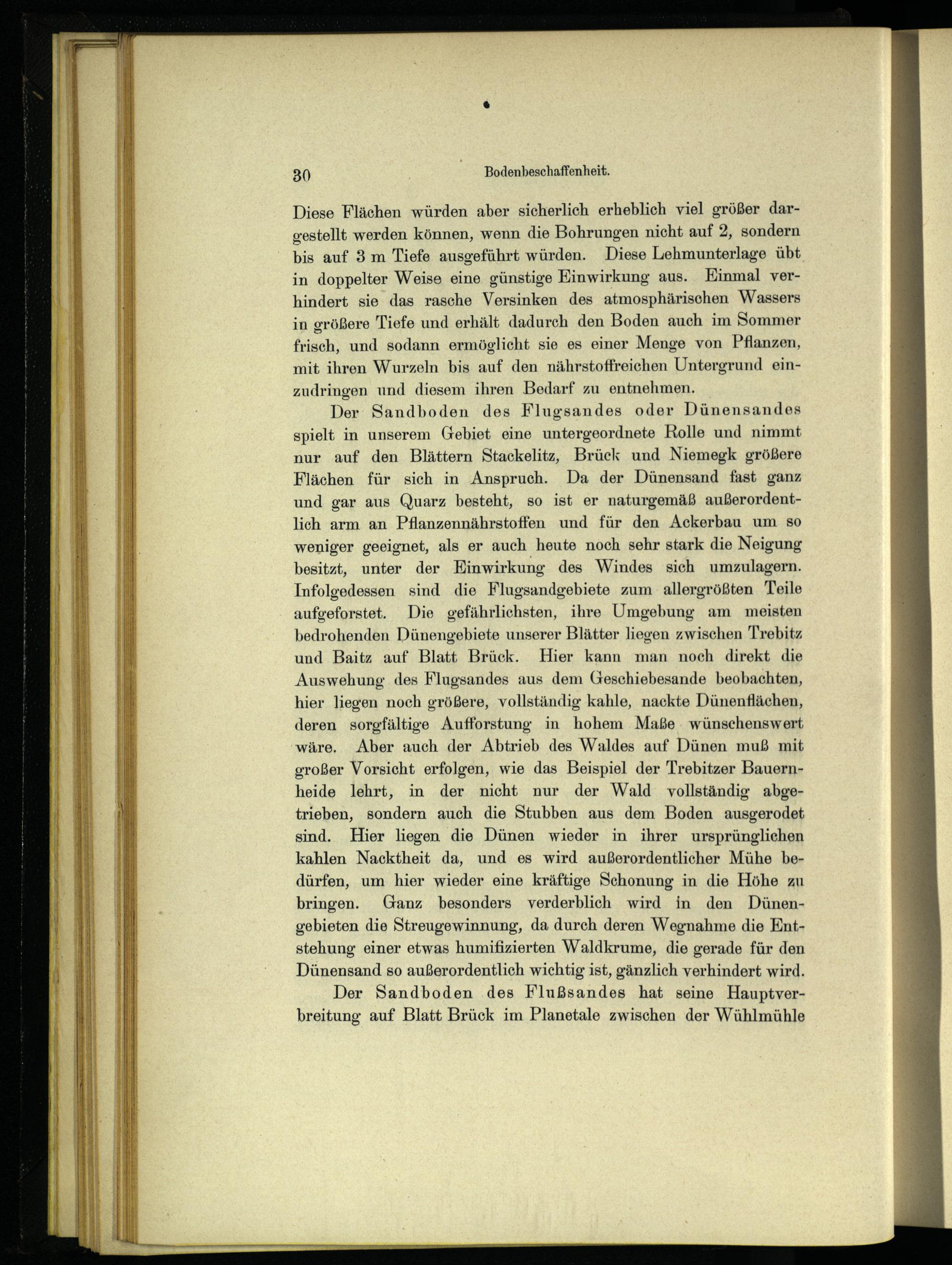 Der: Sandboden des Flugsandes oder Dünensandes spielt in unserem Gebiet eine untergeordnete Rolle und nimmt nur auf den Blättern Stackelitz , Brück und Niemegk größere Flächen für sich in Anspruch. Da der Dünensand fast ganz und gar aus Quarz besteht, so ist er naturgemäß außerordentlich arm an Pflanzennährstoffen und für den Ackerbau um so weniger geeignet, als er auch heute noch sehr stark die Neigung besitzt, unter der Einwirkung des Windes sich umzulagern. Infolgedessen sind die Flugsandgebiete zum allergrößten Teile aufgeforstet. Die gefährlichsten, ihre Umgebung am meisten bedrohenden Dünengebiete unserer Blätter liegen zwischen Trebitz und Baitz auf Blatt Brück . Hier kann man noch direkt die Auswehung des Flugsandes aus dem Geschiebesande beobachten, hier liegen noch größere, vollständig kahle, nackte Dünenflächen, deren sorgfältige Aufforstung in hohem Maße. wünschenswert wäre. Aber auch der Abtrieb des Waldes auf Dünen muß mit großer Vorsicht erfolgen, wie das Beispiel der Trebitzer Bauernheide lehrt, in der nicht nur der Wald vollständig abgetrieben, sondern auch die Stubben aus dem Boden ausgerodet sind. Hier liegen die Dünen wieder in ihrer ursprünglichen kahlen Nacktheit da, und es wird außerordentlicher Mühe bedürfen, um hier wieder eine kräftige Schonung in die Höhe zu bringen. Ganz besonders verderblich wird in den Dünengebieten die Streugewinnung, da durch deren Wegnahme die Entstehung einer etwas humifizierten Waldkrume, die gerade für den Dünensand so außerordentlich wichtig ist, gänzlich verhindert wird.