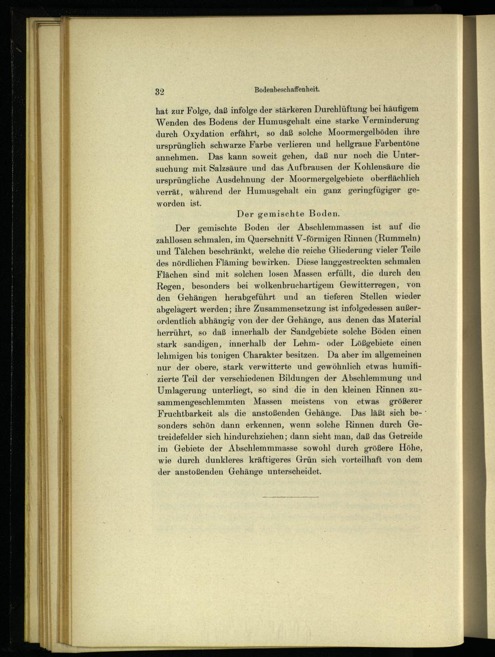 Der gemischte Boden der Abschlemmassen ist auf die zahllosen schmalen, im Querschnitt V-förmigen Rinnen(Rummeln) und Tälchen beschränkt, welche die reiche Gliederung vieler Teile des nördlichen Fläming bewirken. Diese langyestreckten schmalen Flächen sind mit solchen losen Massen erfüllt, die durch den Regen, besonders bei wolkenbruchartigem Gewitterregen, von den Gehängen herabgeführt und an tieferen Stellen wieder abgelagert werden; ihre Zusammensetzung ist infolgedessen außerordentlich abhängig von der der Gehänge, aus denen das Material herrührt, so daß innerhalb der Sandgebiete solche Böden einen stark ‚sandigen, innerhalb der Lehm- oder Lößgebiete einen lehmigen bis tonigen Charakter besitzen. Da aber im allgemeinen nur der obere, stark verwitterte und gewöhnlich etwas humifizierte Teil der verschiedenen Bildungen der Abschlemmung und Umlagerung unterliegt, so sind‘die in den kleinen Rinnen zusammengeschlemmten Massen meistens von etwas größerer Fruchtbarkeit als die anstoßenden Gehänge. Das läßt sich be-‘ sonders schön dann erkennen, wenn solche Rinnen durch Getreidefelder sich hindurchziehen; dann sieht man, daß das Getreide im Gebiete der Abschlemmmasse sowohl durch größere Höhe, wie durch dunkleres kräftigeres Grün sich vorteilhaft von dem der anstoßenden Gehänge unterscheidet.