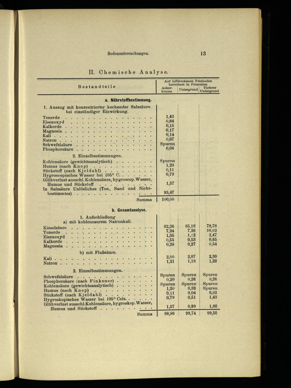 Schwefelsäure‘ Spuren Spuren| Spuren Phosphorsäure(nach Finkener) We 0,20 0,26 0,26 Kohlensäure(gewichtsanalytisch)....++ Spuren Spuren Spuren Humus(nach Knop). NN 1,20 0,38| Spuren Stickstoff(nach Kjeldahl). 0,11 0,04 0,08 Hygroskopisches Wasser bei 1050 Cels.. 0,79 0,51 1,43 Glühverlust ausschl.Kohlensäure, hyeroskop- Wasser,