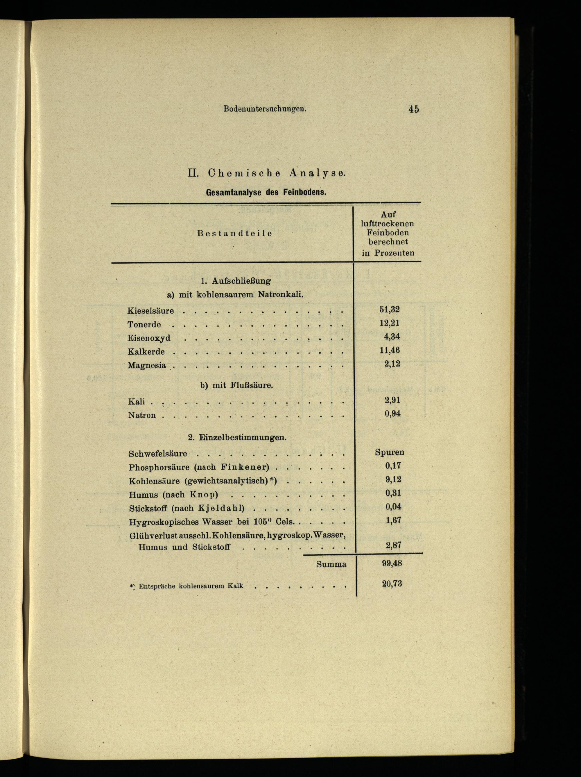 2. Einzelbestimmungen. Schwefelsäure Phosphorsäure(nach Finkener). Kohlensäure(gewichtsanalytisch)*) Humus(nach Knop) Stickstoff(nach Kjeldahl) Hygroskopisches Wasser bei 105° Cels..