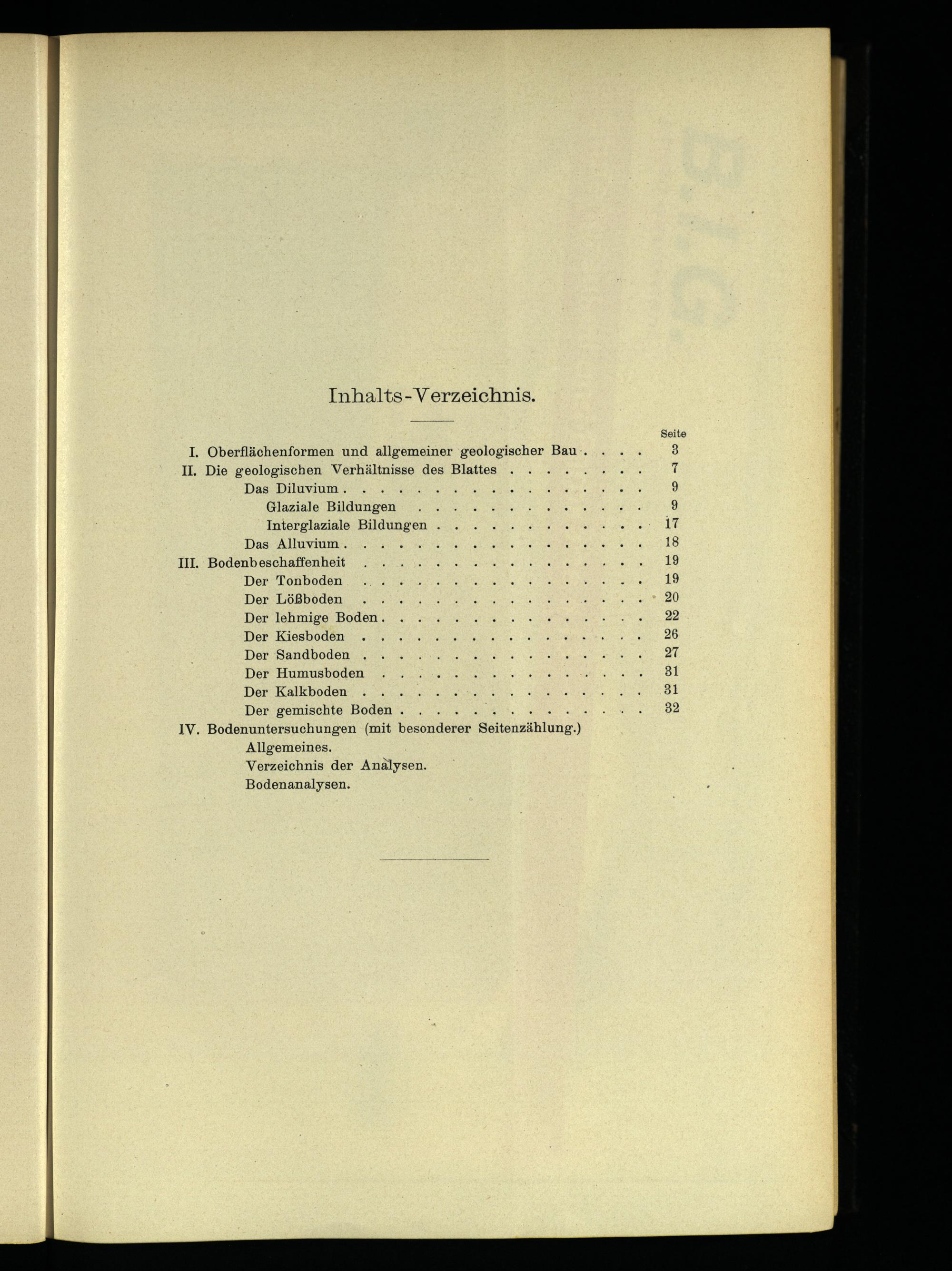 I. Oberflächenformen und allgemeiner geologischer Bau. II. Die geologischen Verhältnisse des Blattes Das Diluvium. Glaziale Bildungen Interglaziale Bildungen. Das Alluvium. III. Bodenbeschaffenheit Der Tonboden Der Lößboden Der lehmige Boden. Der Kiesboden Der Sandboden Der Humusboden Der Kalkboden Der gemischte Boden.. J1V. Bodenuntersuchungen(mit besonderer ‚Seitenzählune:) Allgemeines. Verzeichnis der Analysen. Bodenanalysen.