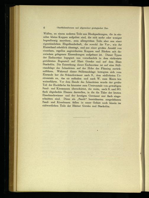 Wällen, zu einem anderen Teile aus Blockpackungen, die in einzelne kleine Kuppen aufgelöst sind, die sich mehr oder weniger bogenförmig anordnen, zum allergrößten Teile aber aus einer eigentümlichen Hügellandschatt, die sowohl ihr Vor-, wie ihr Hinterland erheblich überragt, und aus einer großen Anzahl von einzelnen, regellos angeordneten Kuppen und Rücken mit dazwischen gelegenen Einsenkungen aufgebaut ist. Dieser Typus der Endmoräne begegnet uns vornehmlich in dem rückwärts gerichteten Bogenteil auf Blatt Görzke und auf dem Blatt Stackelitz . Die Entstehung dieser Endmoräne ist auf eine Stillstandslage des Inlandeises auf der Höhe des Fläming zurückzuführen. Während dieser Stillstandslage bewegten sich vom Kisrande her die Schmelzwässer nach S., dem südlichsten Urstromtale zu, das sie aufnahm und nach W. zum Meere hin weiterführte. Vor dem Rande des Inlandeises wurde. der größte Teil der Hochfläche bis hinunter zum Urstromtale von gewaltigen Sand- und Kiesmassen überschüttet, die weite, nach S. und SO. flach abgedachte Ebenen darstellen, in die die Täler der letzten Kisschmelzwässer und der heutigen Gewässer nur flach eingeschnitten sind. Diese als„Sandr“ bezeichneten ausgedehnten Sand- und Kiesebenen fallen in unser Gebiet noch hinein im südwestlichen Teile der Blätter Görzke und Stackelitz .
