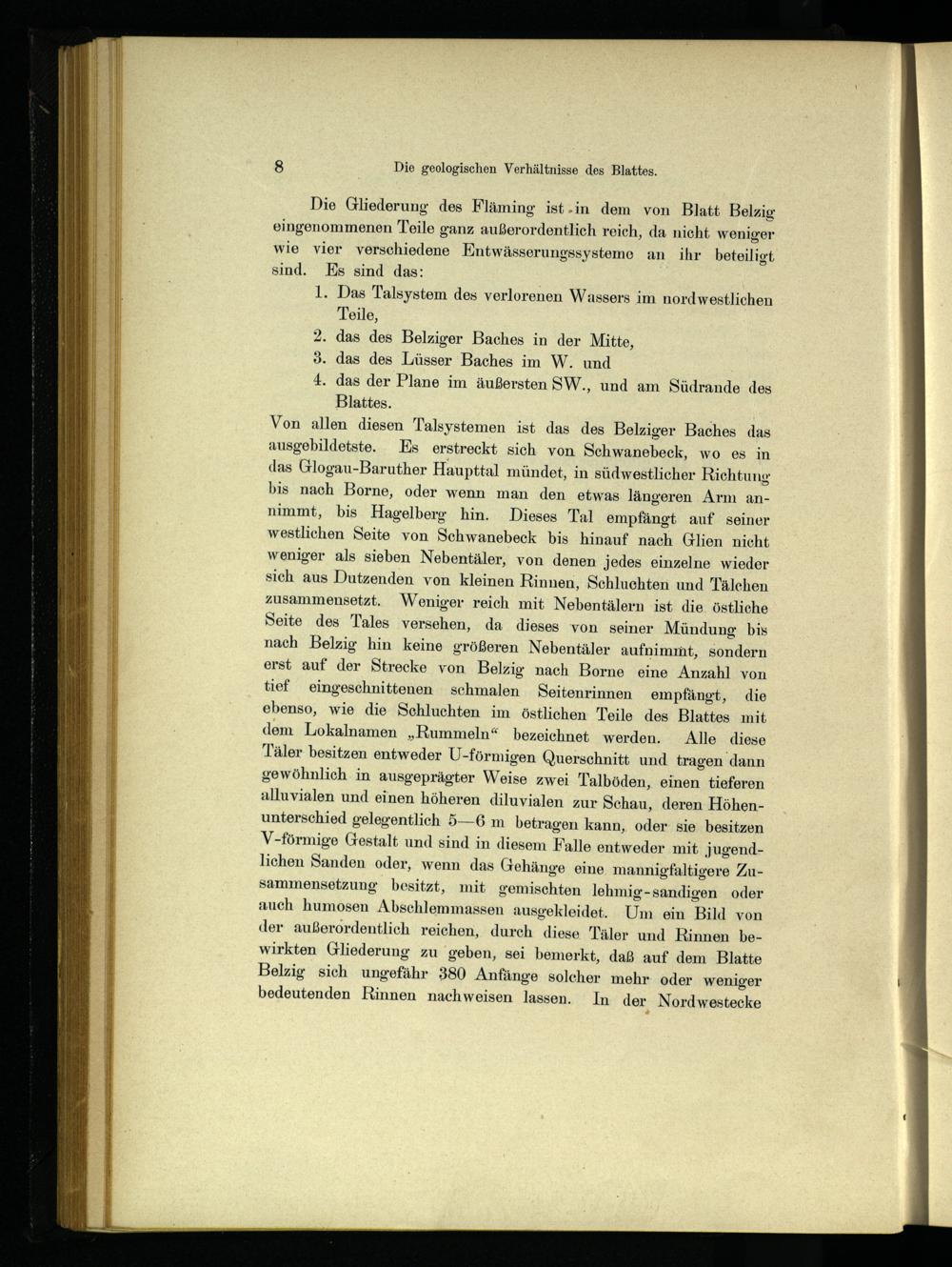 Blattes. Von allen diesen Talsystemen ist das des Belziger Baches das ausgebildetste. Es erstreckt sich von Schwanebeck, wo es in das Glogau -Baruther Haupttal mündet, in südwestlicher Richtung bis nach Borne, oder wenn man den etwas längeren Arm annimmt, bis Hagelberg hin.. Dieses Tal empfängt auf seiner westlichen Seite von Schwanebeck bis hinauf nach Glien nicht weniger als sieben Nebentäler, von denen jedes einzelne wieder sich aus Dutzenden von kleinen Rinnen, Schluchten und Tälchen zusammensetzt. Weniger reich mit Nebentälern ist die. östliche Seite des Tales versehen, da dieses von seiner Mündung bis nach Belzig hin keine größeren Nebentäler aufnimmt, sondern erst auf der Strecke von Belzig nach Borne eine Anzahl von tief eingeschnittenen schmalen Seitenrinnen empfängt, die ebenso, wie die Schluchten im östlichen Teile des Blattes mit dem Lokalnamen„Rummeln“ bezeichnet werden. Alle diese Täler besitzen entweder U-förmigen Querschnitt und tragen dann gewöhnlich in ausgeprägter Weise zwei Talböden, einen tieferen alluvialen und einen höheren diluvialen zur Schau, deren Höhenunterschied gelegentlich 5—6 m betragen kann, oder sie besitzen V-förmige Gestalt und sind in diesem Falle entweder mit jugendlichen Sanden oder, wenn das Gehänge eine. mannigfaltigere Zusammensetzung besitzt, mit gemischten lehmig-sandigen oder auch humosen Abschlemmassen ausgekleidet. Um ein Bild von der außerordentlich reichen, durch diese Täler und Rinnen bewirkten Gliederung zu geben, sei bemerkt, daß auf dem Blatte Belzig sich ungefähr 380 Anfänge solcher mehr oder weniger bedeutenden Rinnen nachweisen lassen. In der Nordwestecke