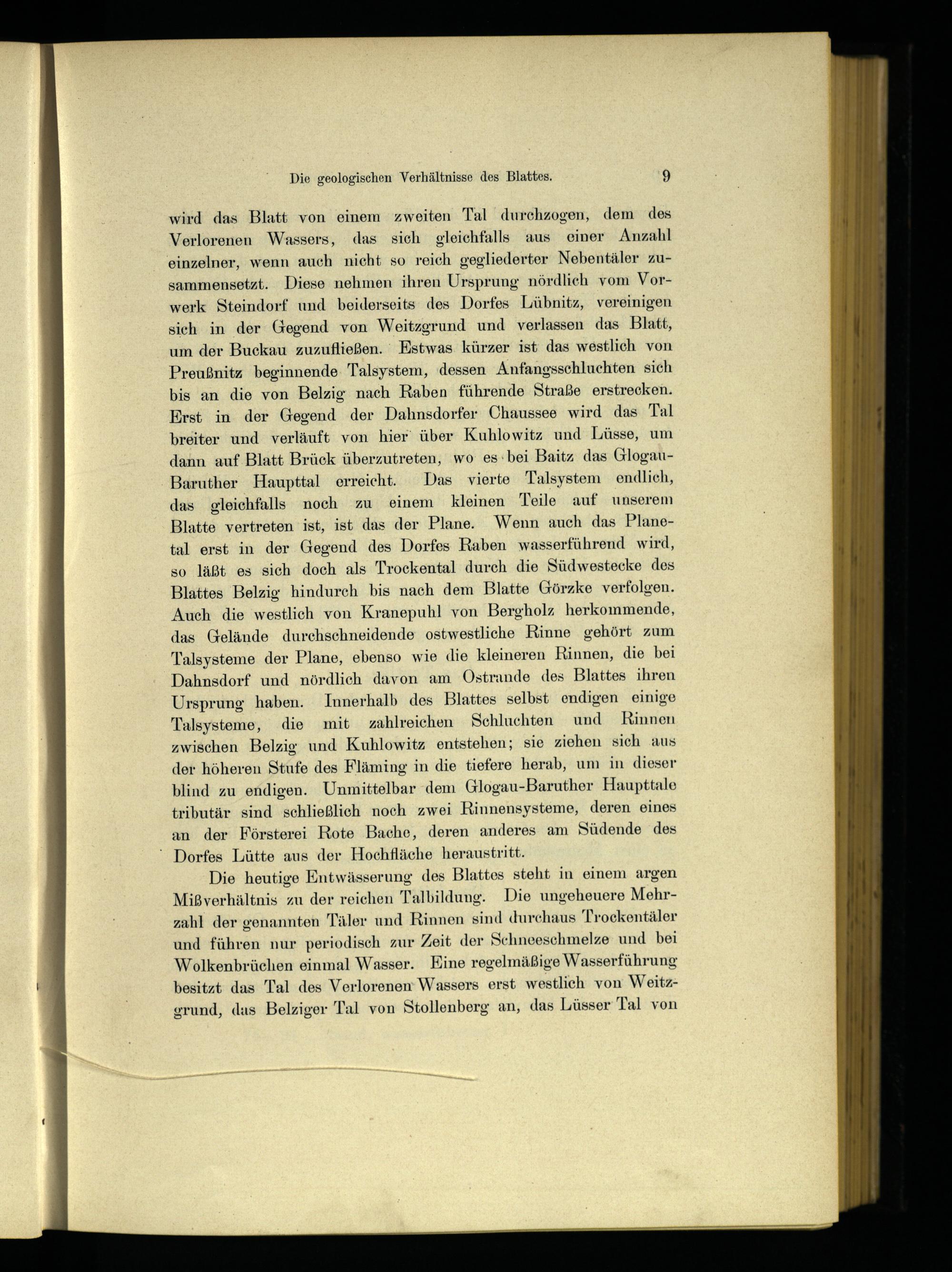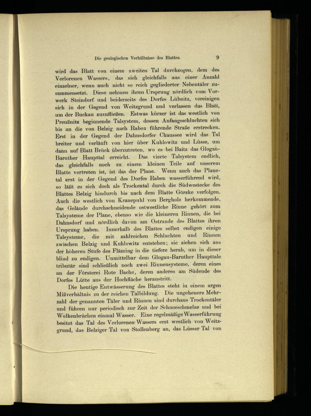 wird das Blatt von einem zweiten Tal durchzogen, dem des Verlorenen Wassers, das sich gleichfalls aus einer Anzahl einzelner, wenn auch nicht so reich gegliederter Nebentäler zusammensetzt. Diese nehmen ihren Ursprung nördlich vom Vorwerk Steindorf und beiderseits des Dorfes Lübnitz, vereinigen sich in der Gegend von Weitzgrund und verlassen das Blatt, um der Buckau zuzufließen. Estwas kürzer ist das westlich von Preußnitz beginnende Talsystem, ‚dessen Anfangsschluchten sich bis an die von Belzig nach Raben führende Straße erstrecken. Erst in der Gegend der Dahnsdorfer Chaussee wird das Tal breiter und verläuft von hier‘ über Kuhlowitz und Lüsse , um dann auf Blatt Brück überzutreten, wo es:bei Baitz das GlogauBaruther Haupttal erreicht. Das vierte Talsystem endlich, das gleichfalls noch zu einem kleinen Teile auf unserem Blatte vertreten ist, ist das der Plane. Wenn auch das Plane tal erst in der Gegend des Dorfes Raben wasserführend wird, so läßt es sich doch als Trockental durch die Südwestecke des Blattes Belzig hindurch bis nach dem Blatte Görzke verfolgen. Auch die westlich von Kranepuhl von Bergholz herkommende, das Gelände durchschneidende ostwestliche Rinne gehört zum Talsysteme der Plane, ebenso wie die kleineren Rinnen, die bei Dahnsdorf und nördlich davon am Ostrande des Blattes ihren Ursprung haben. Innerhalb des Blattes selbst endigen einige Talsysteme, die mit zahlreichen Schluchten und Rinnen zwischen Belzig und Kuhlowitz entstehen; sie ziehen sich aus der höheren Stufe des Fläming in die tiefere herab, um in dieser blind zu endigen. Unmittelbar dem Glogau -Baruther Haupttale tributär sind schließlich noch zwei Rinnensysteme, deren eines an der Försterei Rote Bache, deren anderes am Südende‘des Dorfes Lütte aus der Hochfläche heraustritt.