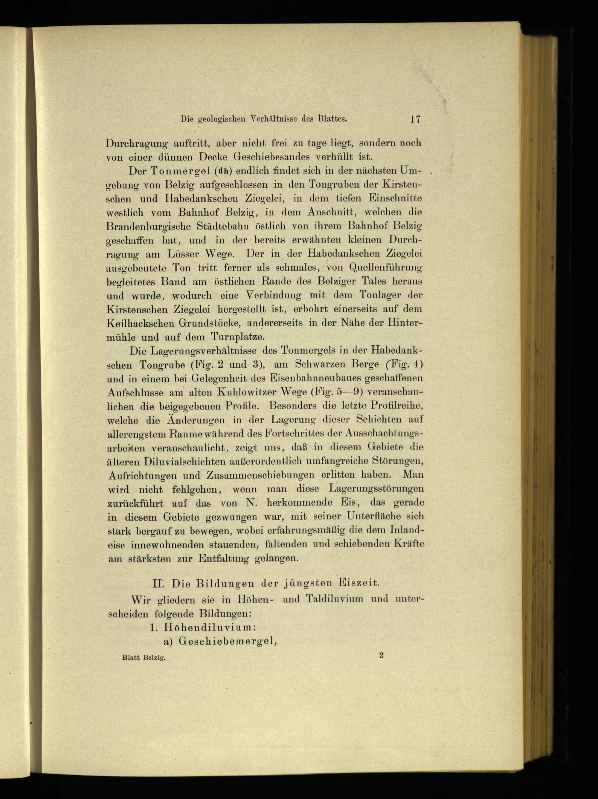Der Tonmergel(dh) endlich findet sich in der nächsten Umgebung von Belzig aufgeschlossen in den Tongruben der Kirstenschen und Habedankschen Ziegelei, in dem tiefen Einschnitte westlich vom Bahnhof Belzig , in dem Anschnitt, welchen die Brandenburgische Städtebahn östlich von ihrem Bahnhof Belzig geschaffen hat, und in der bereits erwähnten kleinen Durchragung am Lüsser Wege. Der in der Habedankschen Ziegelei ausgebeutete Ton tritt ferner als schmales,' von Quellenführung begleitetes Band am östlichen Rande des Belziger Tales heraus und wurde, wodurch eine Verbindung mit dem"Tonlager der Kirstenschen Ziegelei hergestellt ist, erbohrt einerseits auf dem Keilhackschen Grundstücke, andererseits in der Nähe der Hintermühle und auf dem Turnplatze.