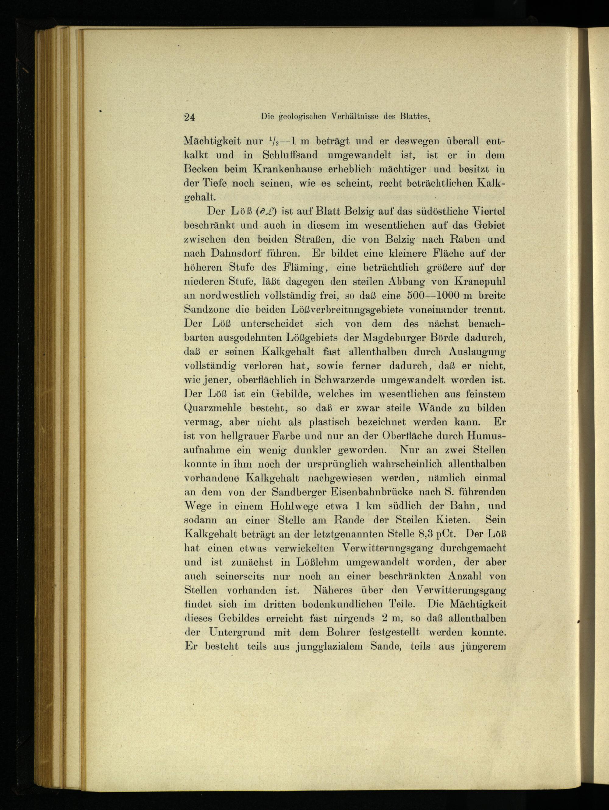 Der Löß(6.£) ist auf Blatt Belzig auf das südöstliche Viertel beschränkt und auch in diesem im wesentlichen auf das Gebiet zwischen den beiden Straßen, die von Belzig nach Raben und nach Dahnsdorf führen. Er bildet eine kleinere Fläche auf der höheren Stufe des Fläming, eine beträchtlich größere auf der niederen Stufe, läßt dagegen den steilen Abbang von Kranepuhl an nordwestlich vollständig frei, so daß eine 500—1000 m breite Sandzone die beiden Lößverbreitungsgebiete voneinander trennt. Der Löß unterscheidet sich von dem des nächst benachbarten ausgedehnten Lößgebiets der Magdeburger Börde dadurch, daß er seinen Kalkgehalt fast allenthalben durch Auslaugung vollständig verloren hat, sowie ferner dadurch, daß er nicht, wie jener, oberflächlich in Schwarzerde umgewandelt worden ist. Der Löß ist ein Gebilde, welches im wesentlichen aus feinstem Quarzmehle besteht, so daß er zwar steile Wände zu bilden vermag, aber nicht als plastisch bezeichnet werden kann. Er ist von hellgrauer Farbe und nur an der Oberfläche durch Humusaufnahme ein wenig dunkler geworden. Nur an zwei Stellen konnte in ihm noch der ursprünglich wahrscheinlich allenthalben vorhandene Kalkgehalt nachgewiesen werden, nämlich einmal an dem von der Sandberger Eisenbahnbrücke nach S. führenden Wege in einem Hohlwege etwa 1 km südlich der Bahn, und sodann an einer Stelle am Rande der Steilen Kieten. Sein Kalkgehalt beträgt an der letztgenannten Stelle 8,3 pCt. Der Löß hat einen etwas verwickelten Verwitterungsgang durchgemacht und ist zunächst in Lößlehm umgewandelt worden, der aber auch seinerseits nur noch an einer beschränkten Anzahl von Stellen vorhanden ist. Näheres über den Verwitterungsgang findet sich im dritten bodenkundlichen Teile. Die Mächtigkeit dieses Gebildes erreicht fast nirgends 2 m, so daß allenthalben der Untergrund mit dem Bohrer festgestellt werden konnte.