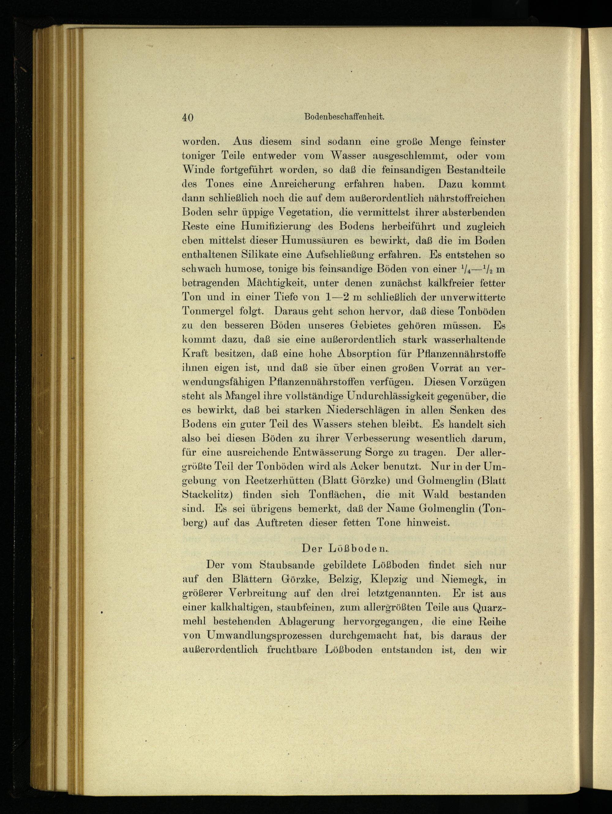 Der vom Staubsande gebildete Lößboden findet sich nur auf den Blättern Görzke , Belzig , Klepzig und. Niemegk , in größerer Verbreitung auf den drei letztgenannten. Kr ist aus einer kalkhaltigen, staubfeinen, zum allererößten Teile aus Quarzmehl bestehenden Ablagerung hervorgegangen, die eine Reihe von Umwandlungsprozessen durchgemacht hat, bis daraus der außerordentlich fruchtbare Lößboden entstanden ist, den wir