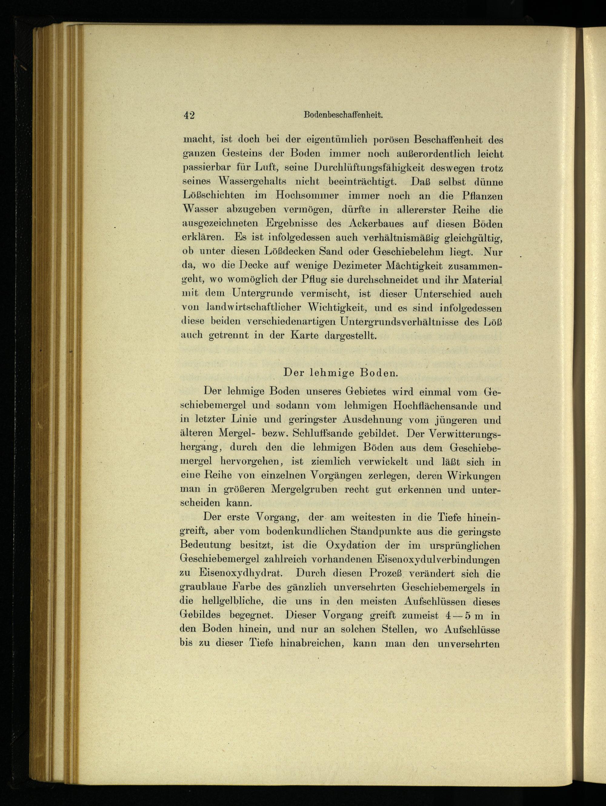Der erste Vorgang, der. am weitesten in die Tiefe hineingreift, aber vom bodenkundlichen Standpunkte aus die geringste Bedeutung besitzt, ist die Oxydation der im ursprünglichen Geschiebemergel zahlreich vorhandenen Eisenoxydulverbindungen zu KEisenoxydhydrat. Durch diesen Prozeß verändert sich die graublaue Farbe des gänzlich unversehrten Geschiebemergels in die hellgelbliche, die uns in den meisten Aufschlüssen dieses Gebildes begegnet. Dieser Vorgang greift zumeist 4—5 m in den Boden hinein, und nur an solchen Stellen, wo Aufschlüsse bis zu dieser Tiefe hinabreichen, kann man den unversehrten