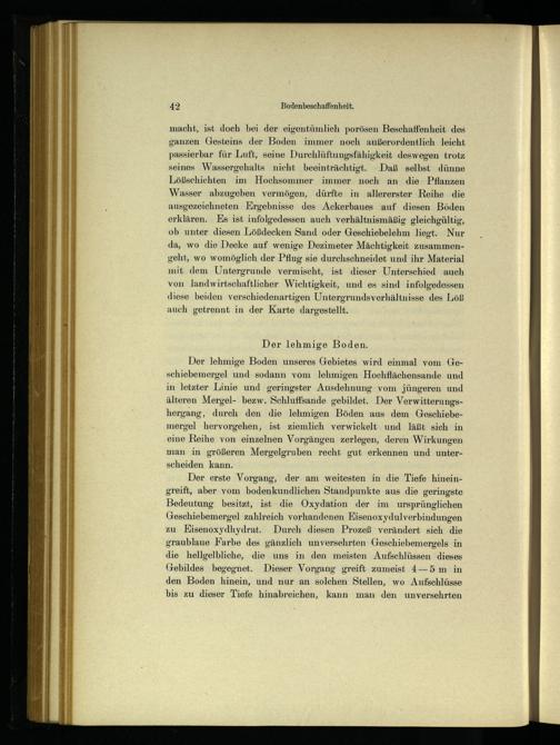 macht, ist doch bei der eigentümlich porösen Beschaffenheit des ganzen Gesteins der Boden immer noch außerordentlich leicht passierbar für Luft, seine Durchlüftungsfähigkeit deswegen trotz seines Wassergehalts nicht beeinträchtigt. Daß selbst dünne Lößschichten im Hochsommer immer noch an die Pflanzen Wasser abzugeben vermögen, dürfte in allererster Reihe die ausgezeichneten Ergebnisse des Ackerbaues auf diesen Böden erklären. Es ist infolgedessen auch verhältnismäßig gleichgültig, ob unter diesen Lößdecken Sand oder Geschiebelehm liegt. Nur da, wo die Decke auf wenige Dezimeter Mächtigkeit zusammengeht, wo womöglich der Pflug sie durchschneidet und ihr Material mit dem Untergrunde vermischt, ist dieser Unterschied auch von landwirtschaftlicher Wichtigkeit, und es sind infolgedessen diese beiden verschiedenartigen Untergrundsverhältnisse des Löß auch getrennt in der Karte dargestellt.